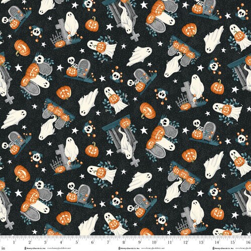 Fabric Henry Glass Glow in the Dark Black Tossed Ghosts by the Quarter Yard Q2026G-99