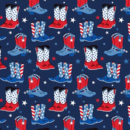 Fabric P & B Textiles Dark Blue Patriotic Cowboy Boots Patriotic Minis by the Quarter Yard PMIN6047-DB