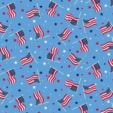 Fabric P & B Textiles Light Blue Tossed American Flags Patriotic Minis by the Quarter Yard PMIN6062-LB