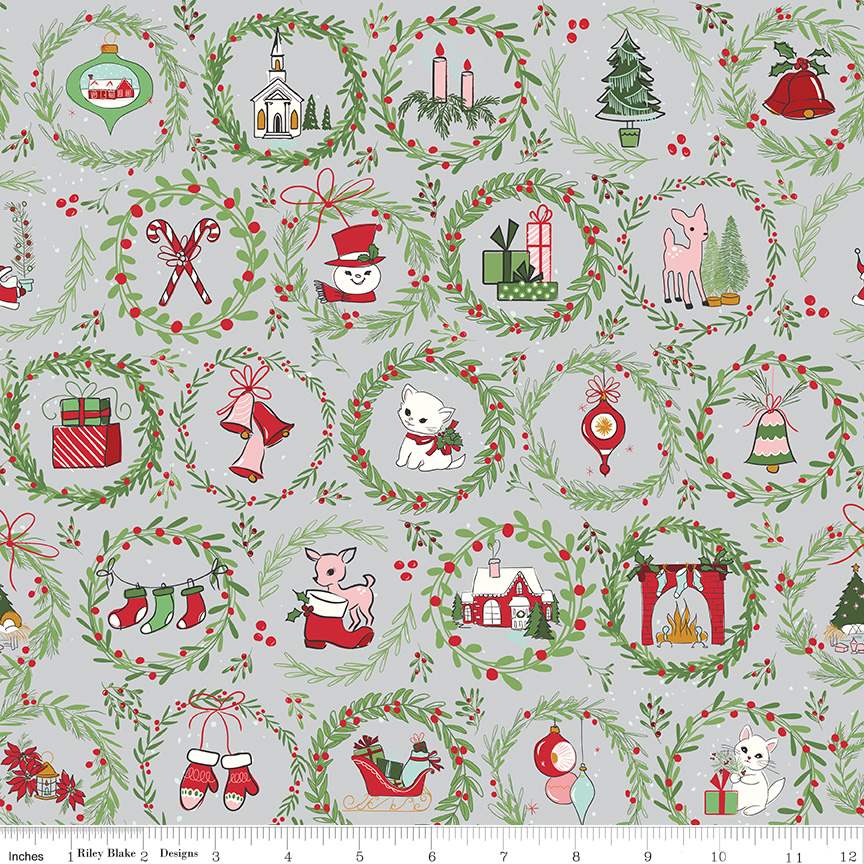 Fabric Riley Blake Silver Wreaths Mistletoe & Holly by the Quarter Yard C16401-SILVER