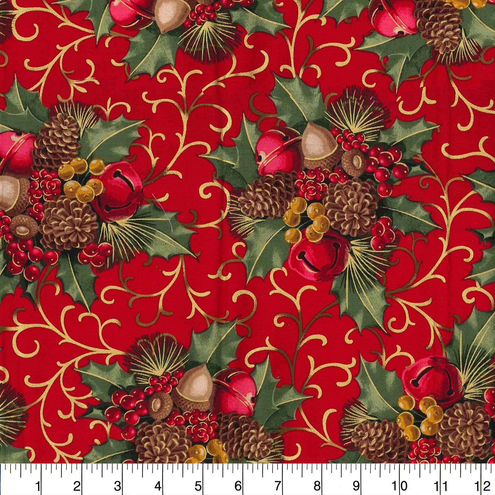 Fabric Traditions Christmas Red Glitter Berries & Bells Cotton Fabric