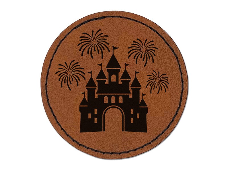 Fairytale Castle and Fireworks Round Iron-On Engraved Faux Leather Patch Applique - 2.5"
