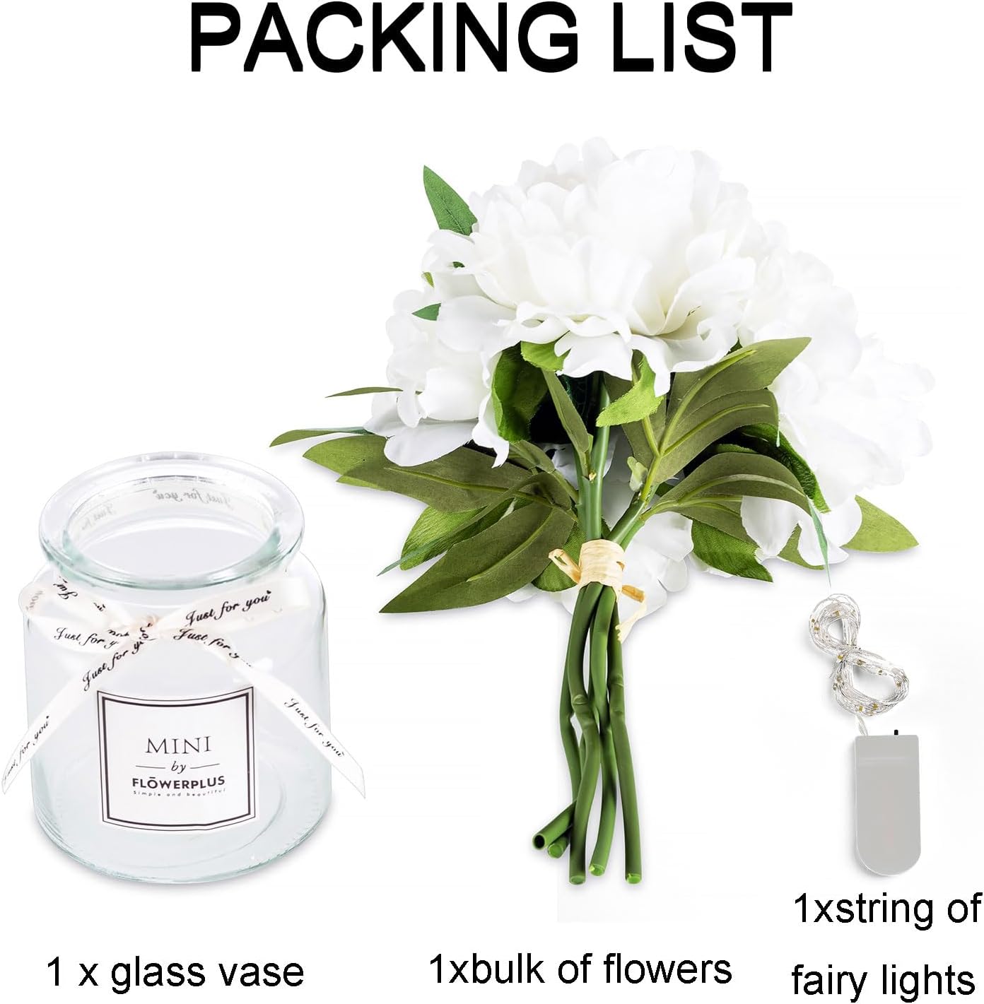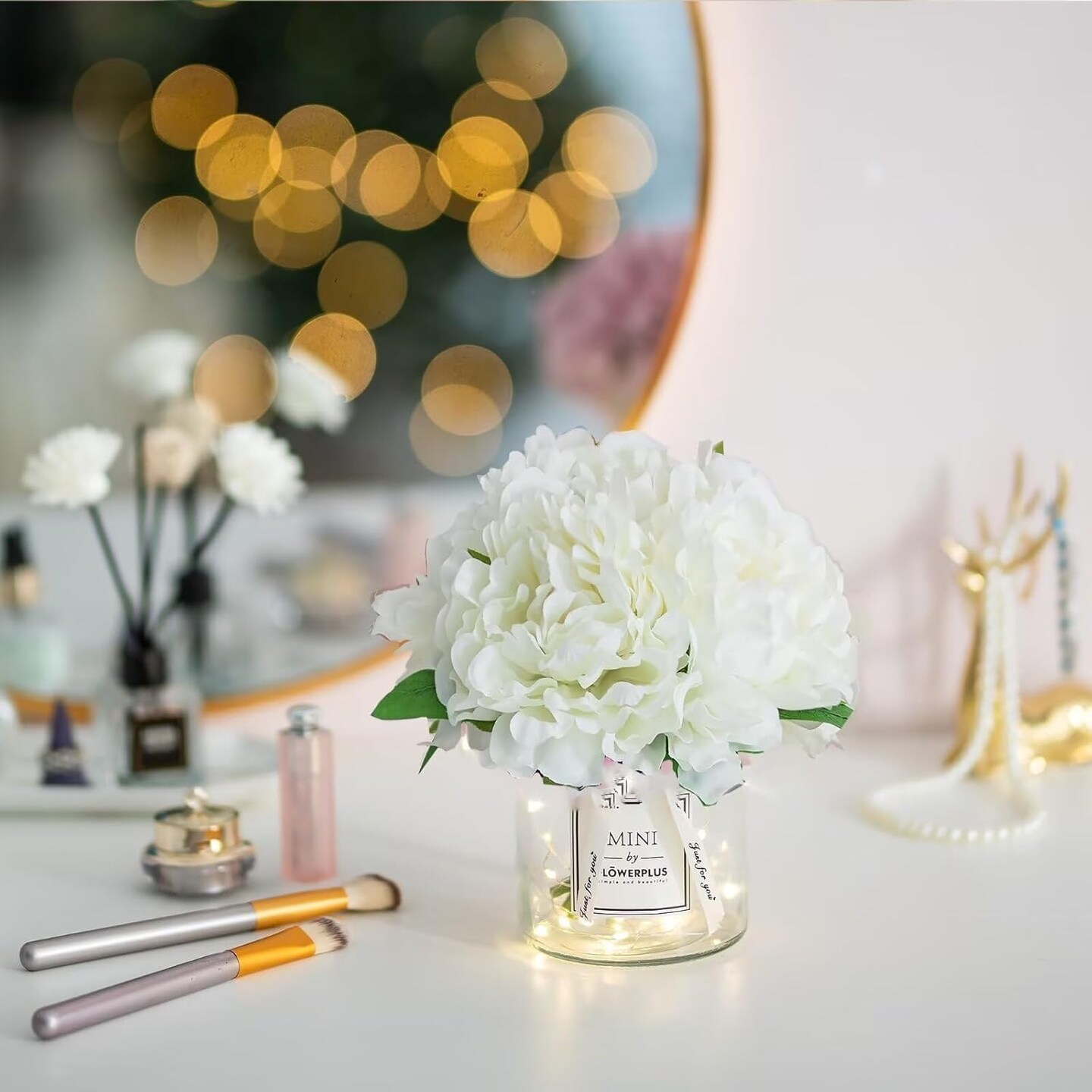 Fake Flowers in Vase for Table: White Artificial Peony with Glass Vase LED Light for Centerpieces Decor - Small Faux Arrangements Desk Vanity Bathroom Office Decoration