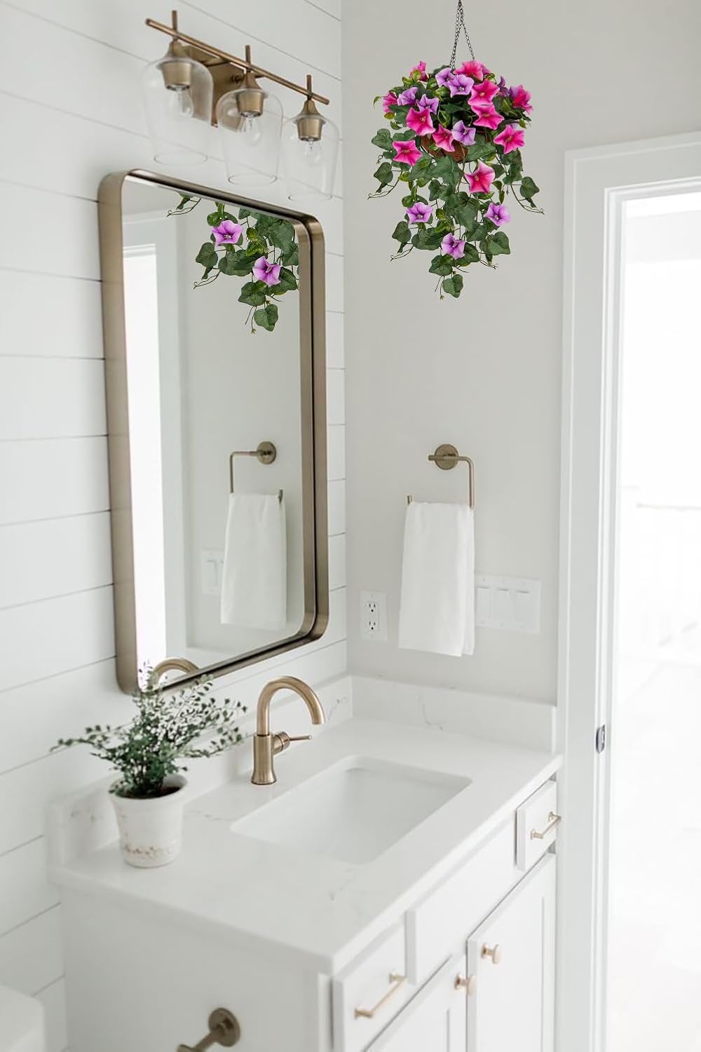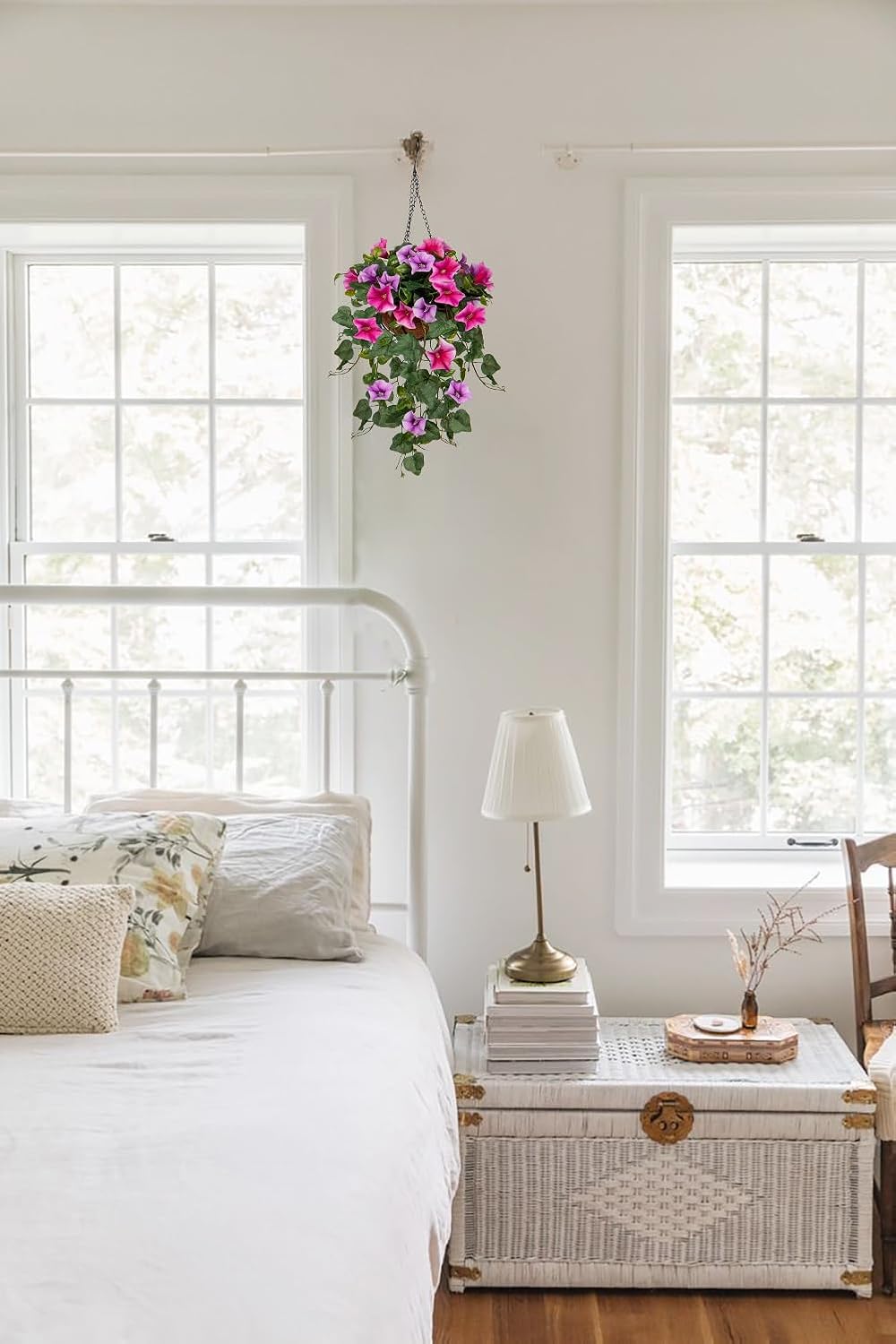 Fake Hanging Flowers with Basket, Artificial Morning Glory Hanging Plants Faux Spring Flowers(Pink Purple)