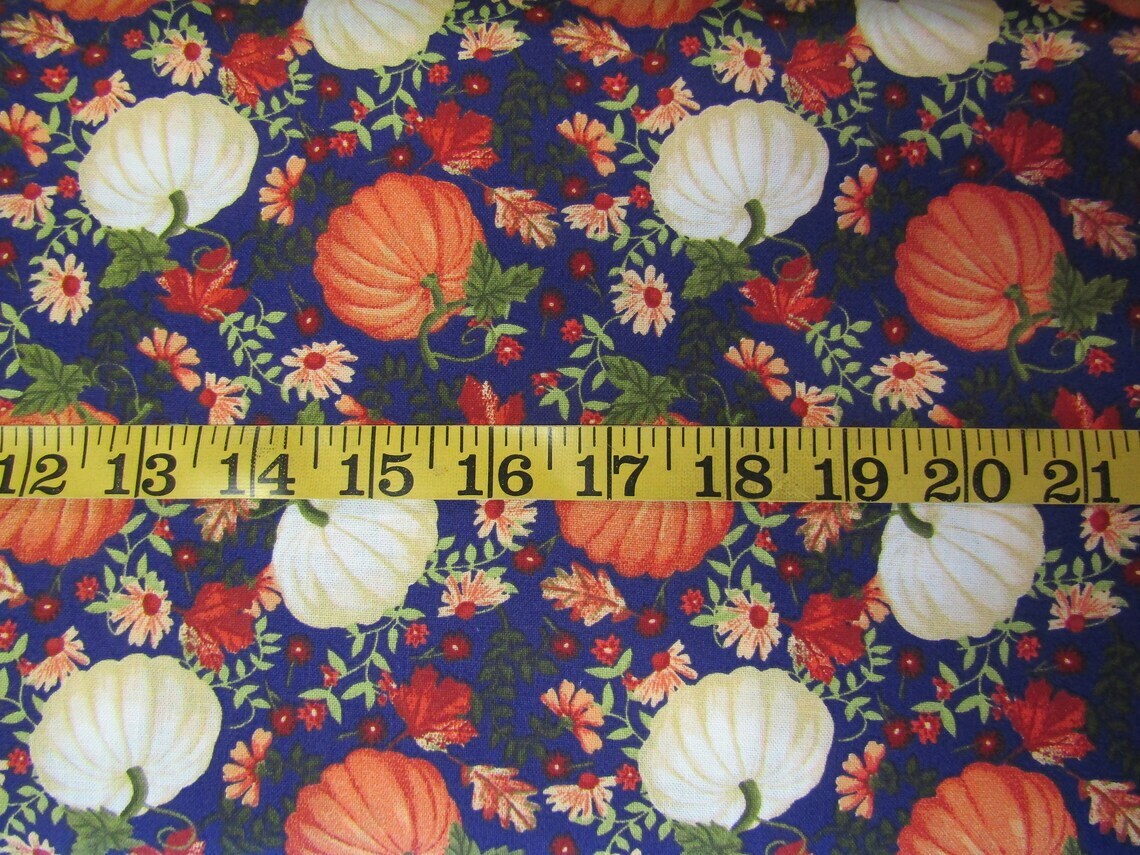 Fall Autumn Thanksgiving Orange and White Pumpkins on Blue 100% Cotton