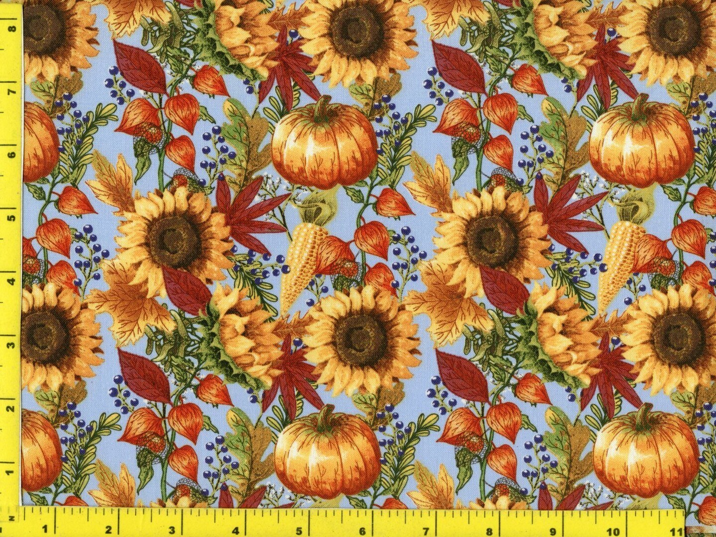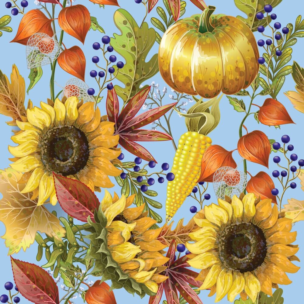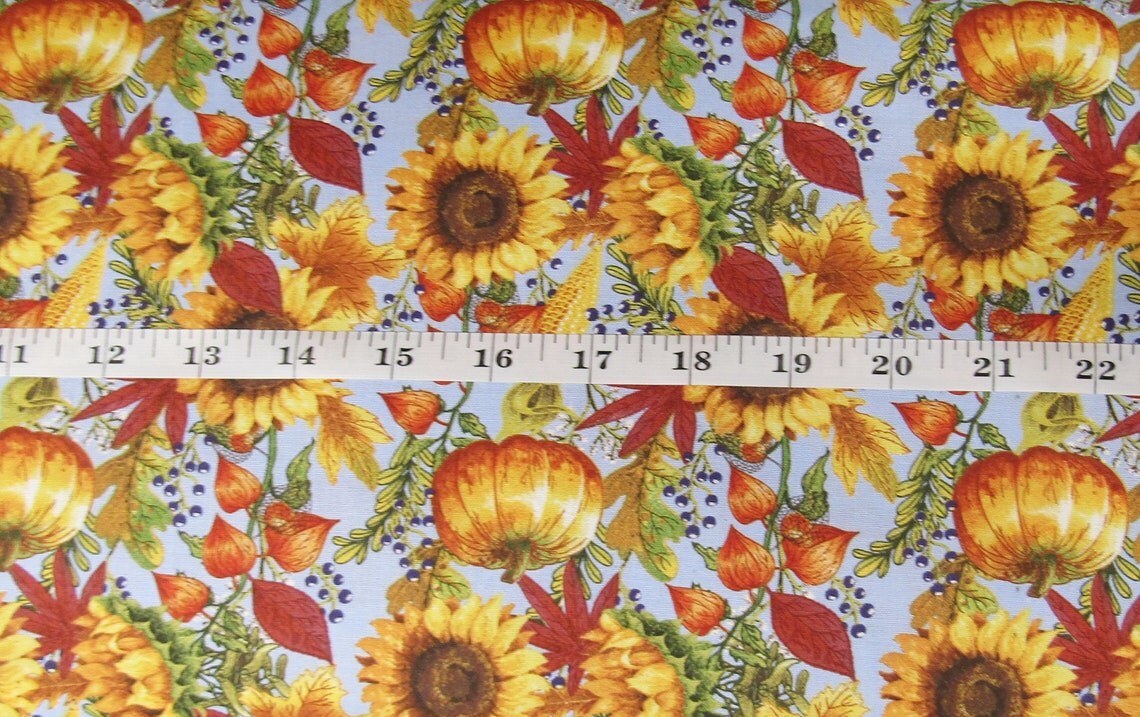 Fall Autumn Thanksgiving Pumpkins and Sunflowers on Light Blue 100% Cotton Fabric