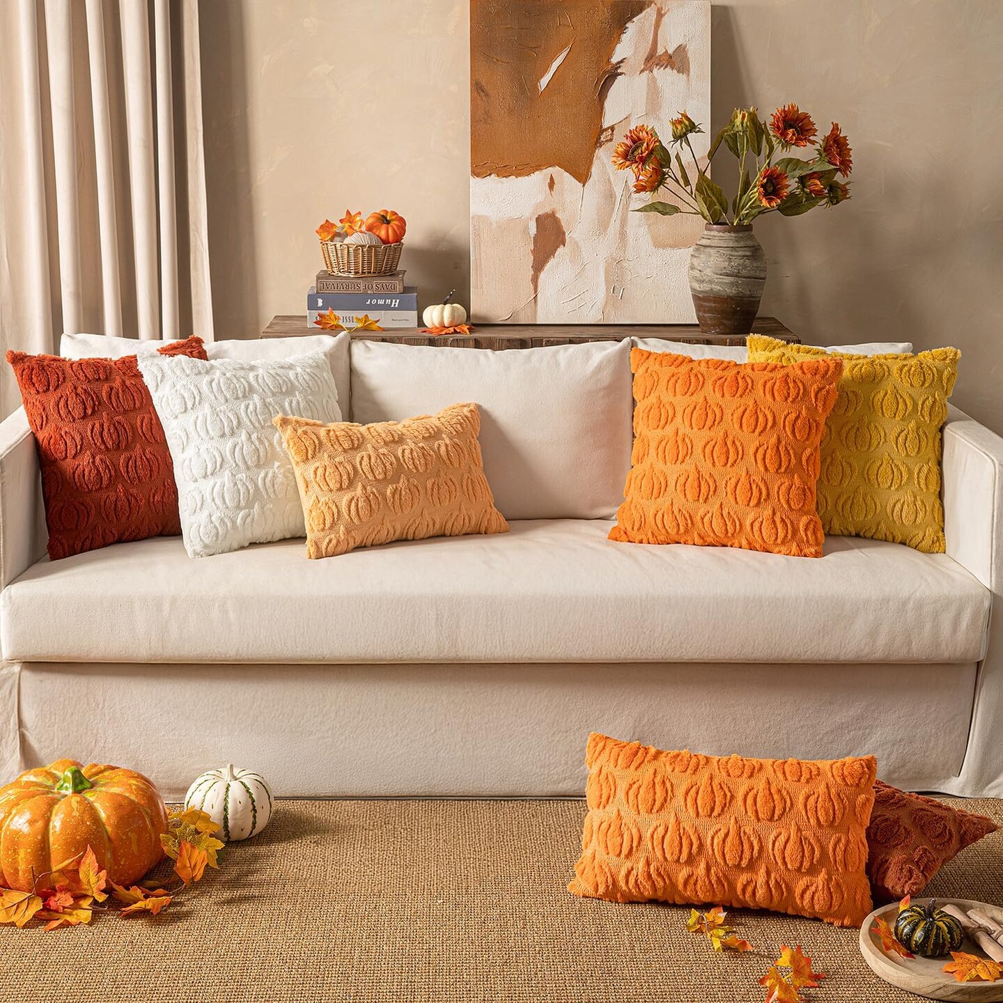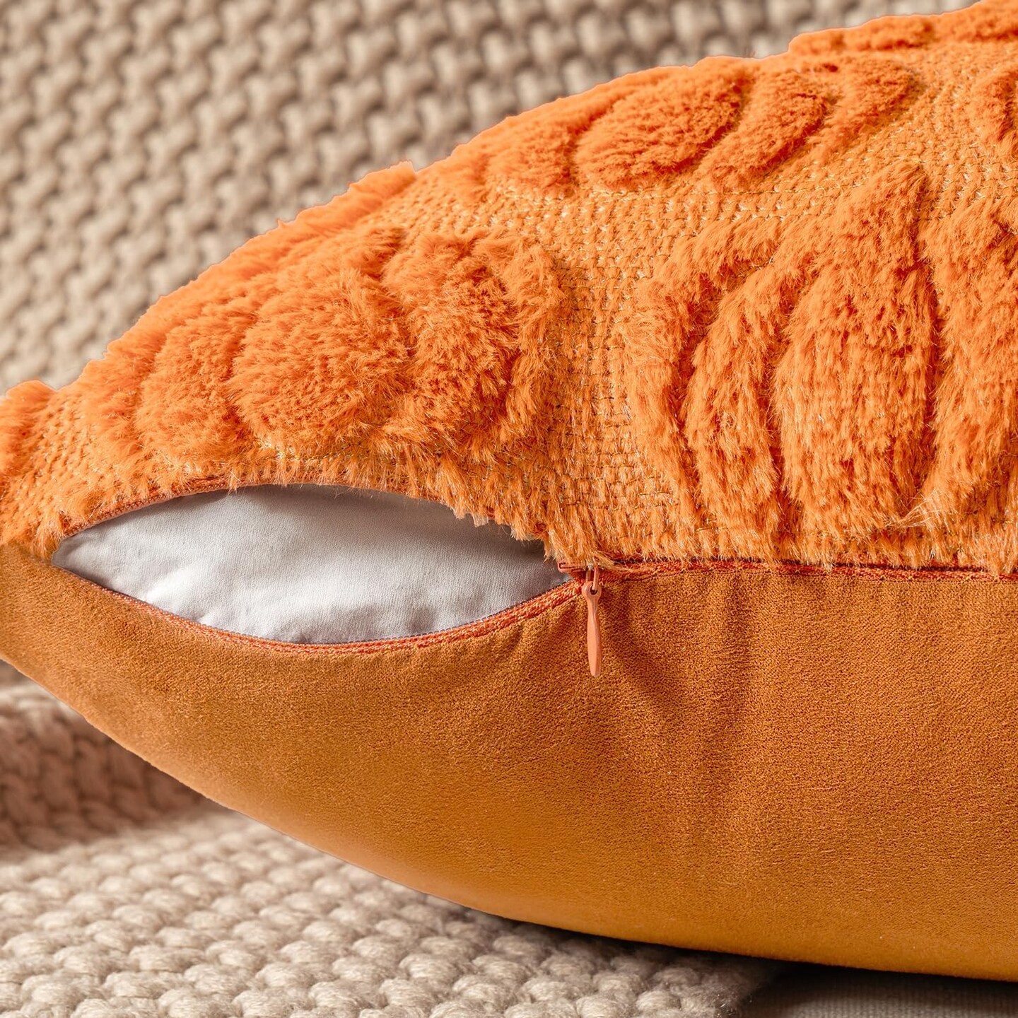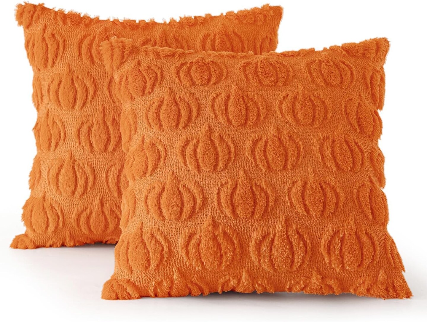 Fall Decorative Pillow Covers 18x18 in – Set of 2 Orange Pumpkin Faux Fur Pillows for Halloween, Thanksgiving, Autumn Harvest, Couch, Sofa, Porch, Bedroom, Living Room