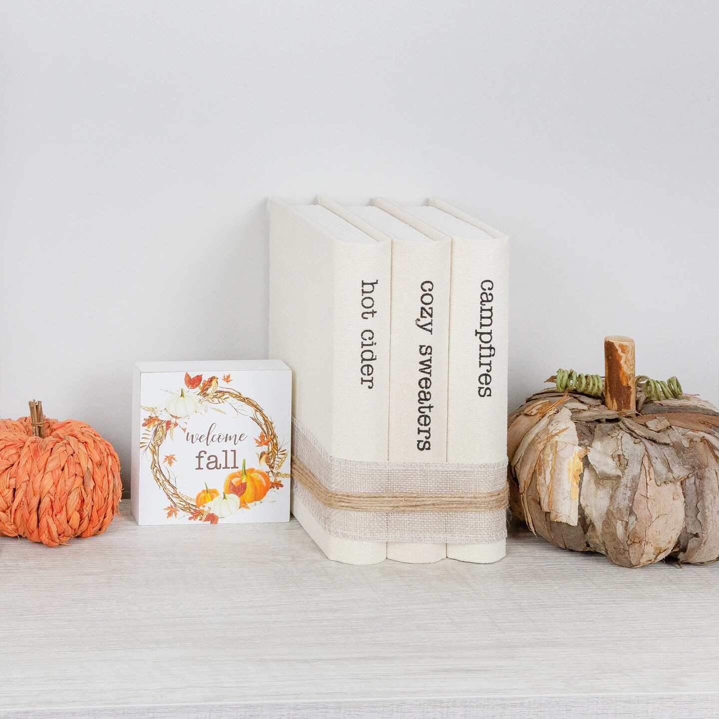 Fall Faux Book Stack Decor with Burlap Ribbon Wrap