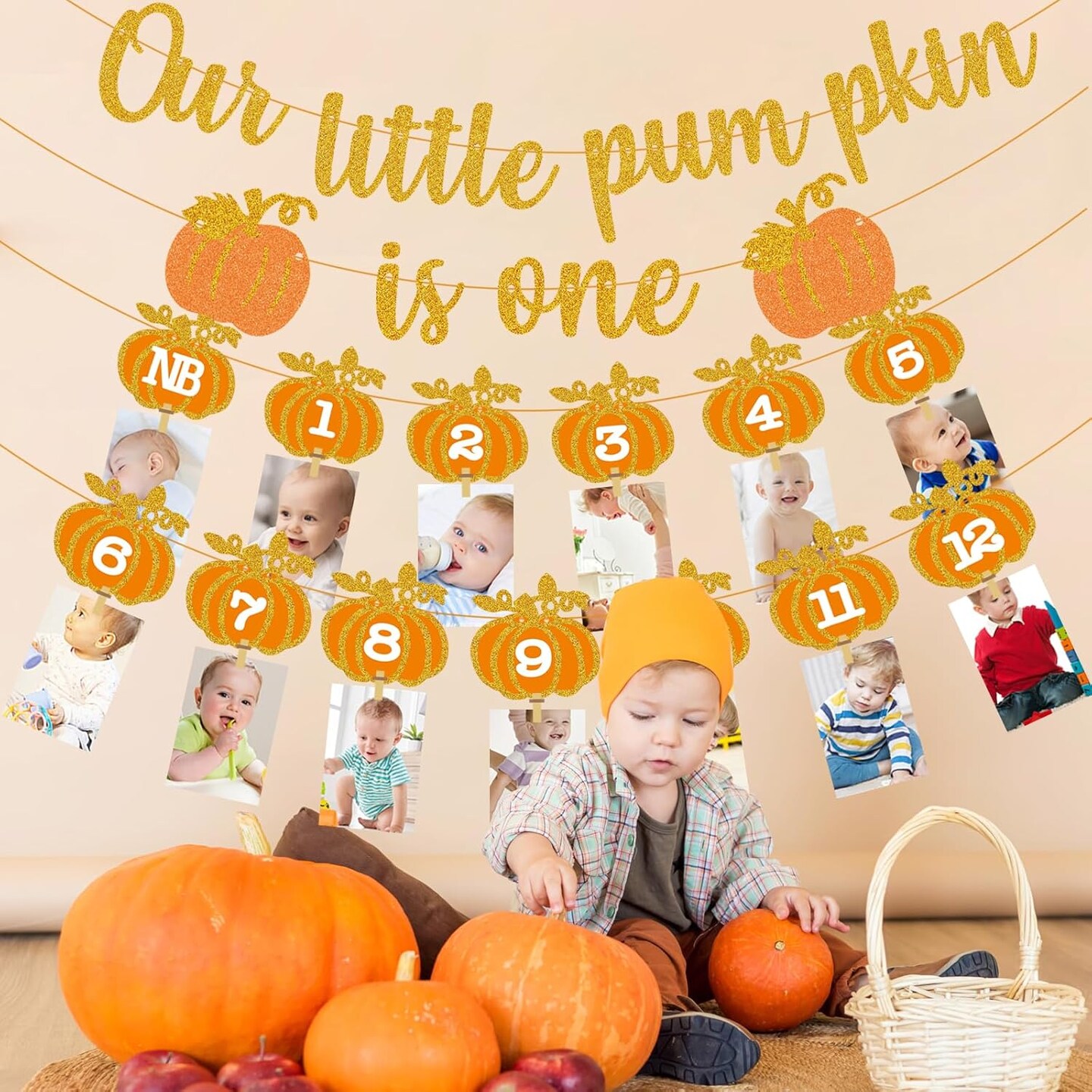 Fall Pumpkin 1st Birthday Photo Banner - Autumn Milestone Photograph Bunting