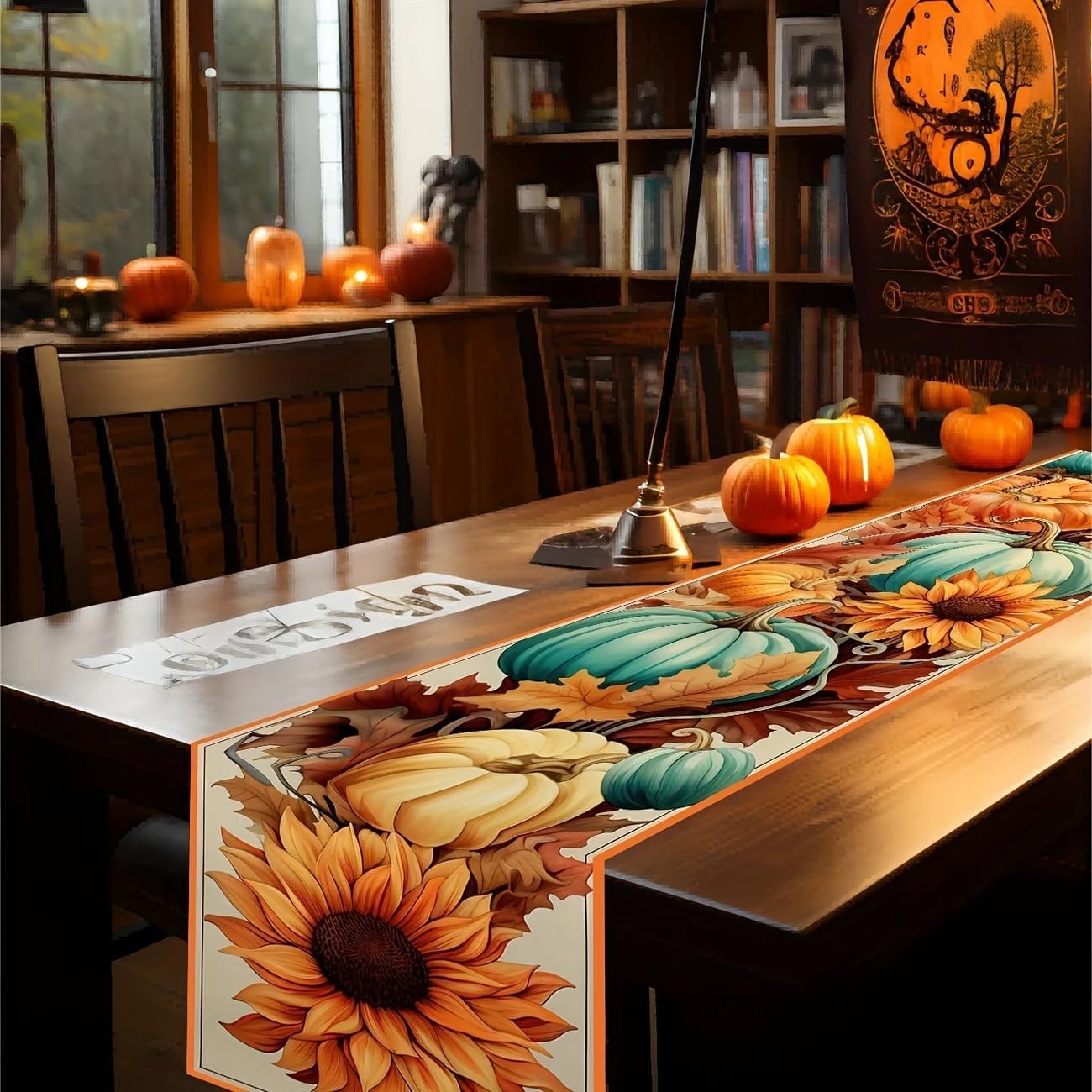 Fall Pumpkin & Sunflower Halloween Table Runner 13x36 Inch – Seasonal Autumn Dining & Kitchen Decor for Holiday Parties (Orange, Brown)