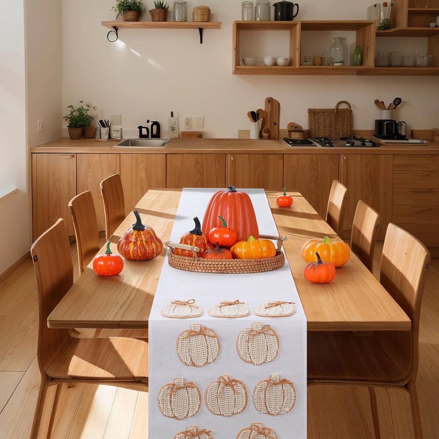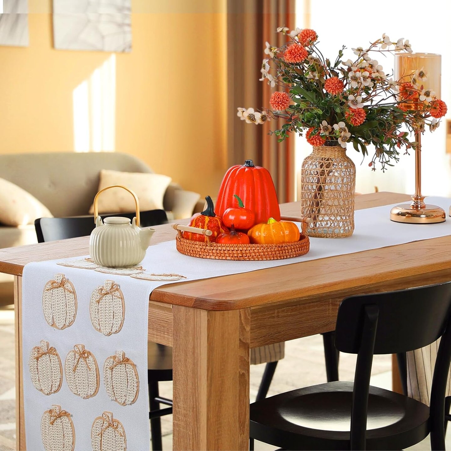 Fall Pumpkins Table Runner 3D Embroidered Handmade Linen (Multi Color) 90 x 14 Inch