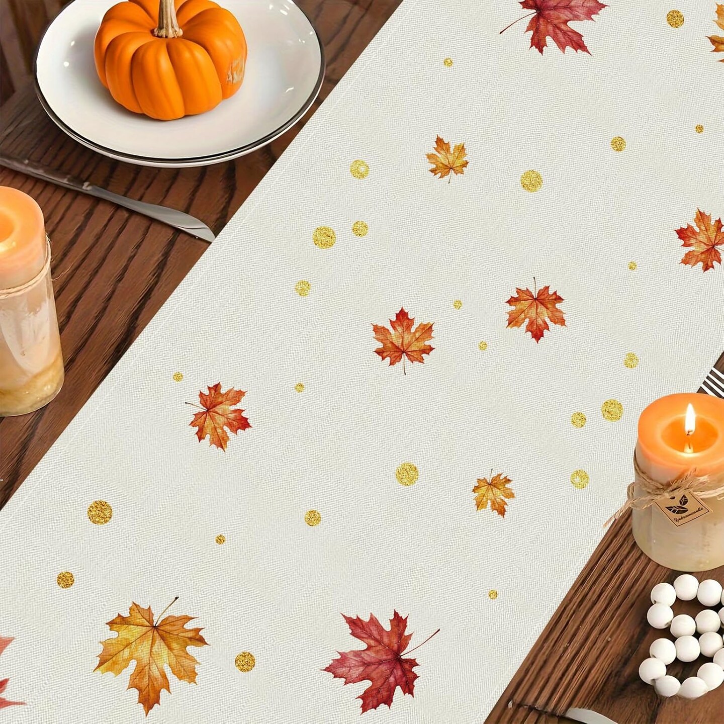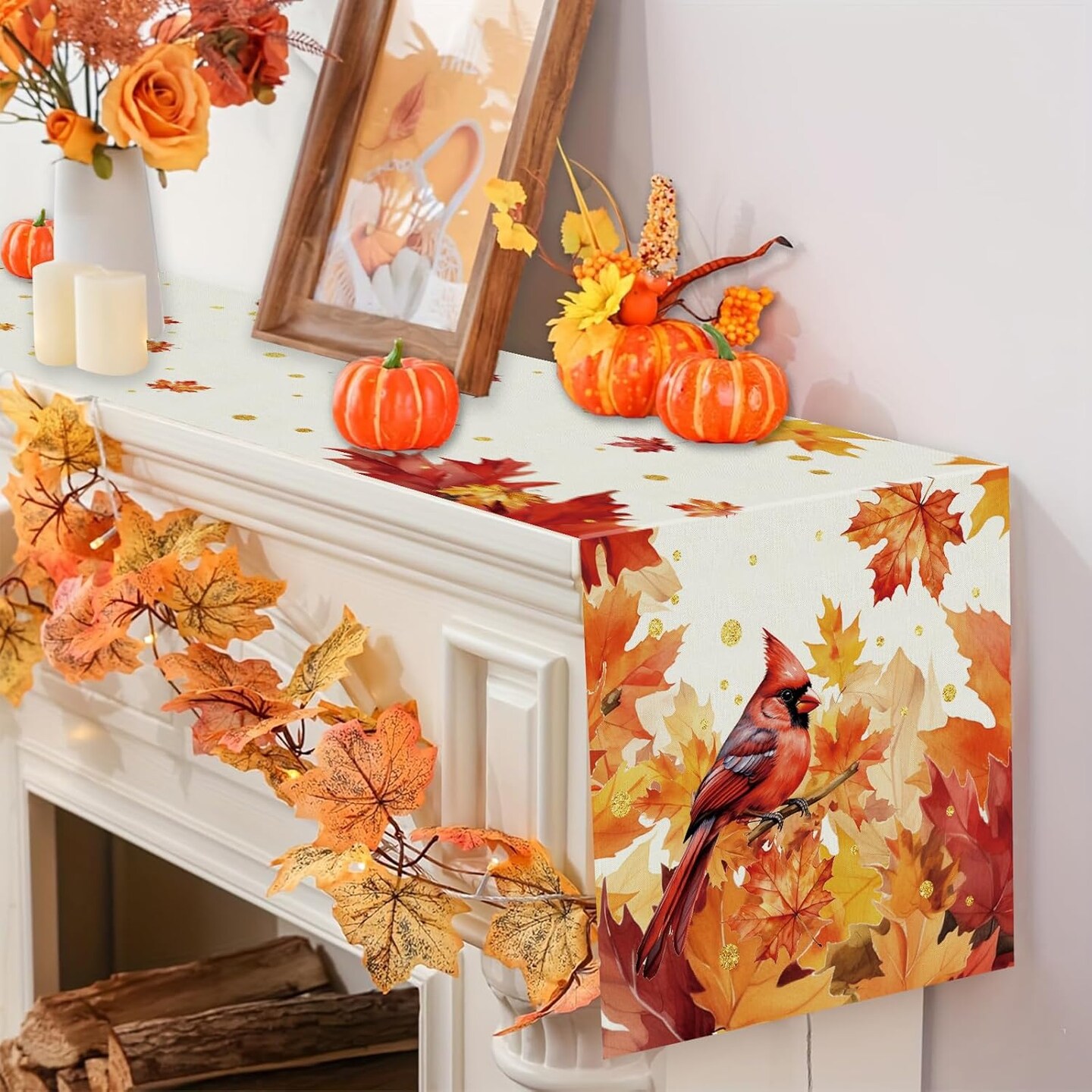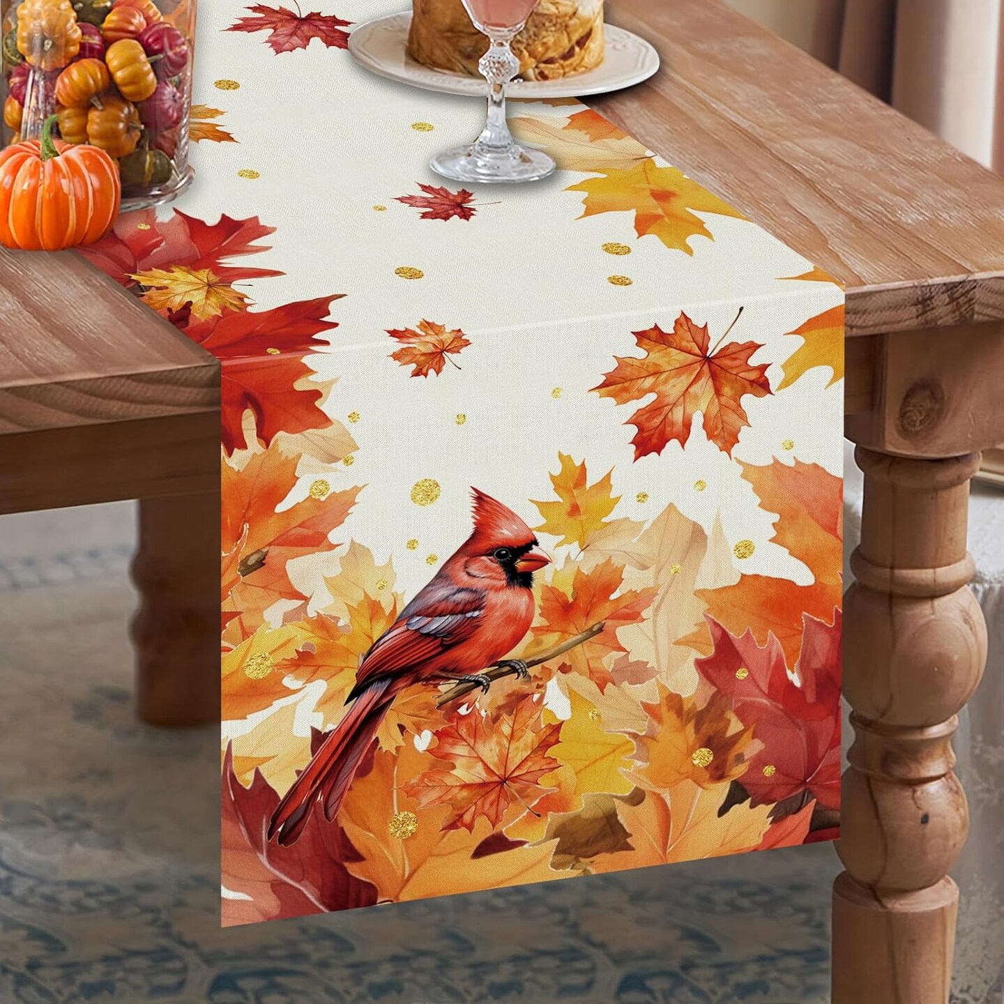 Fall Table Runner – Cardinal Red Bird & Maple Leaves, Autumn Thanksgiving Table Décor, 13 x 72 Inch