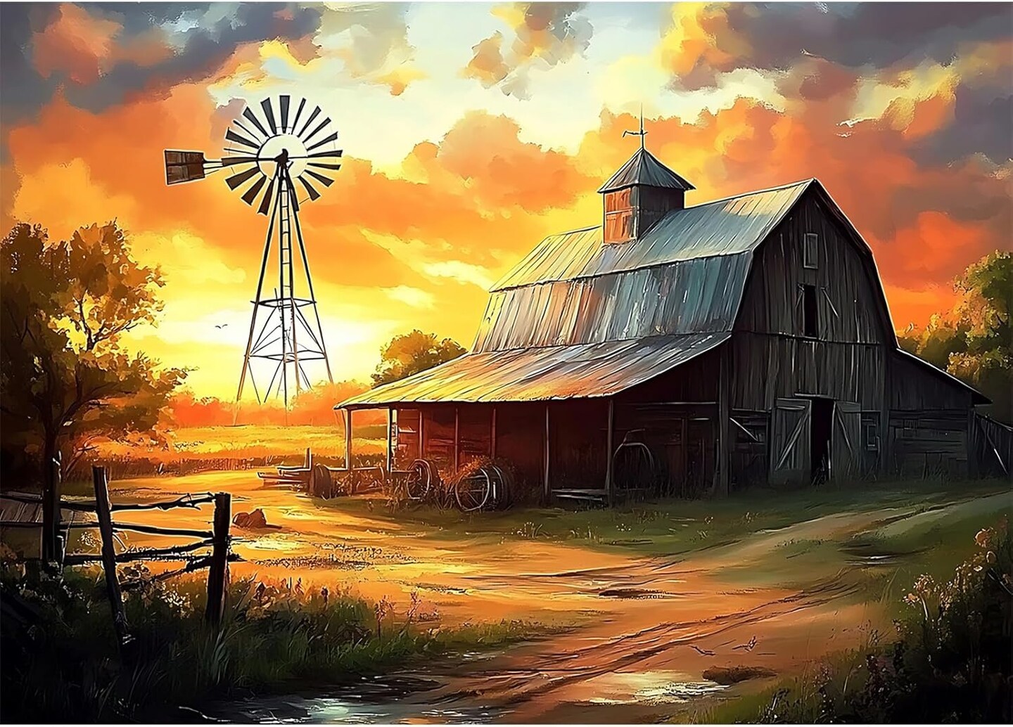 Farmhouse Barn Diamond Art Kits for Adults, 5D DIY Full Drill Rustic Windmill Barn Diamond Painting Dots Crystal Gem Art, Adult Crafts Kits Arts and Crafts