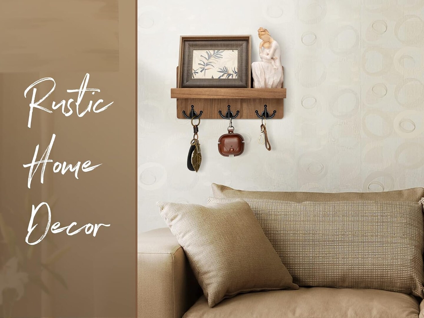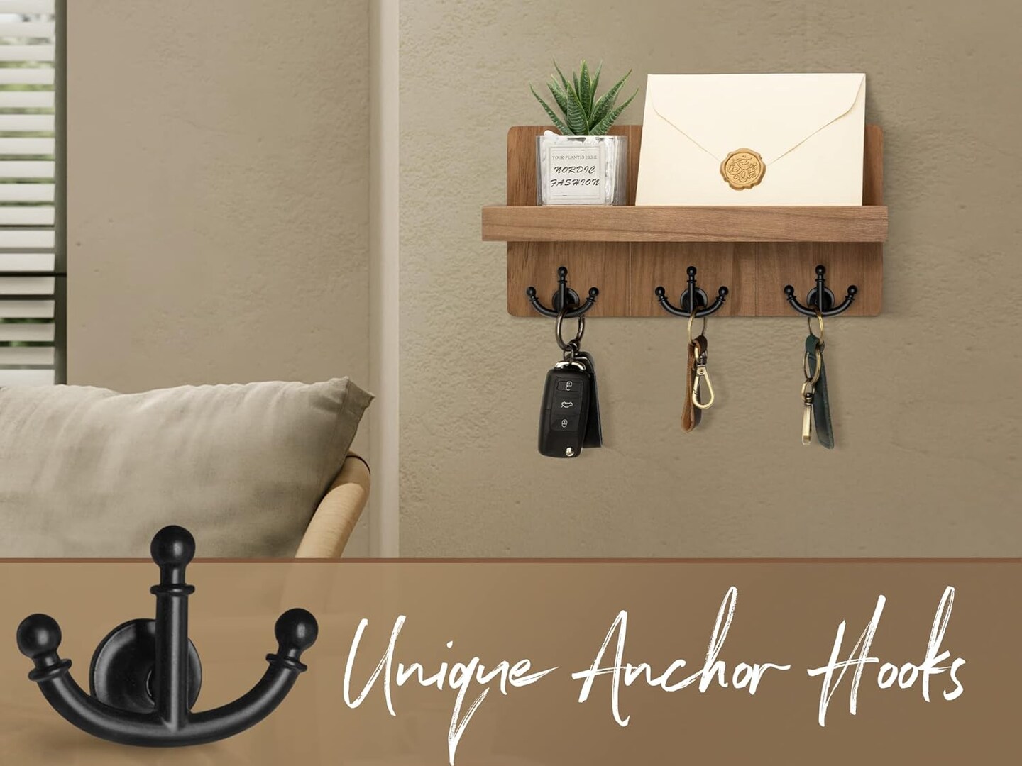 Farmhouse Key Holder for Wall with Shelf: Decorative Mail Organizer and Key Rack Wall Mount with 3 Anchor Hooks - Rustic Entryway Decor (Retro Brown)