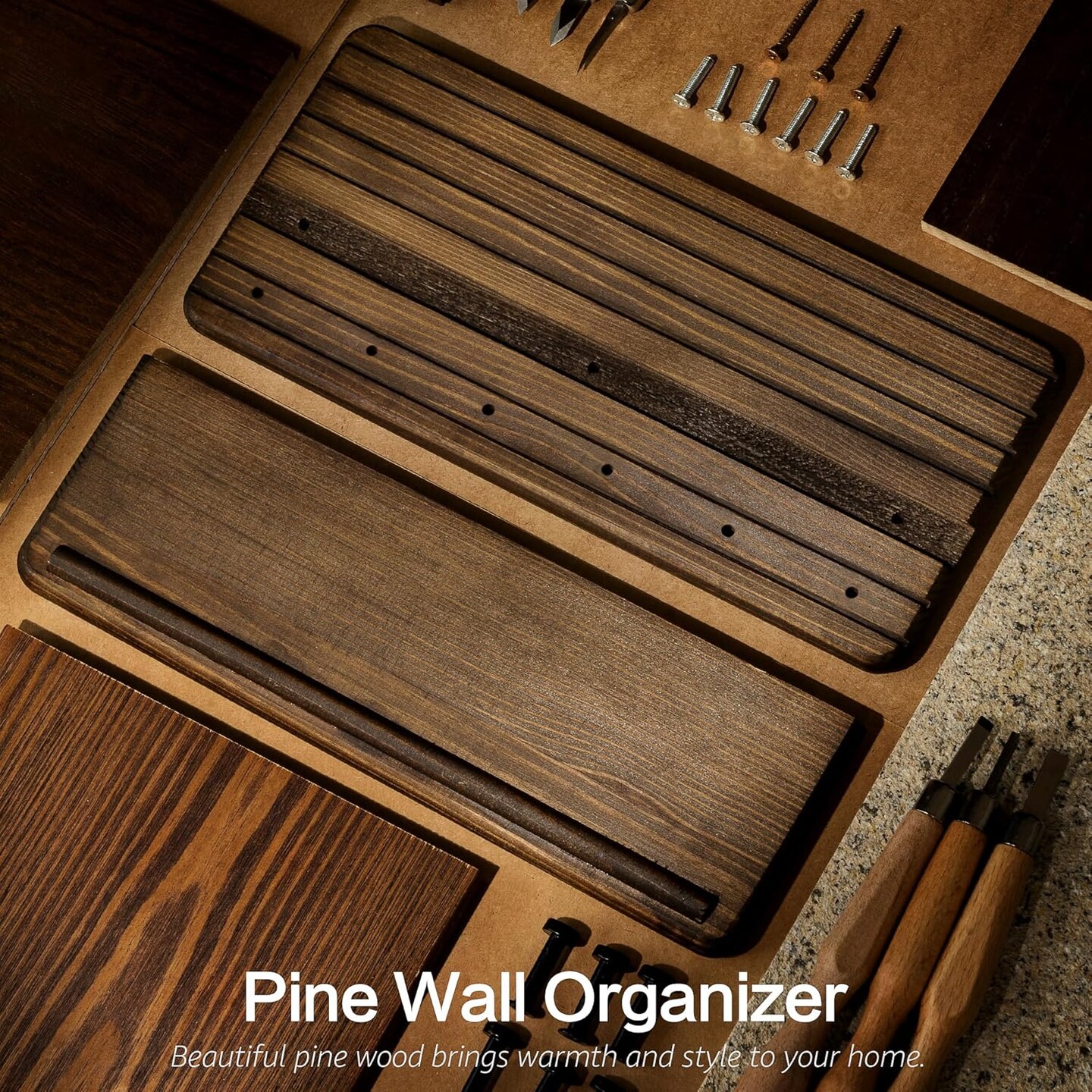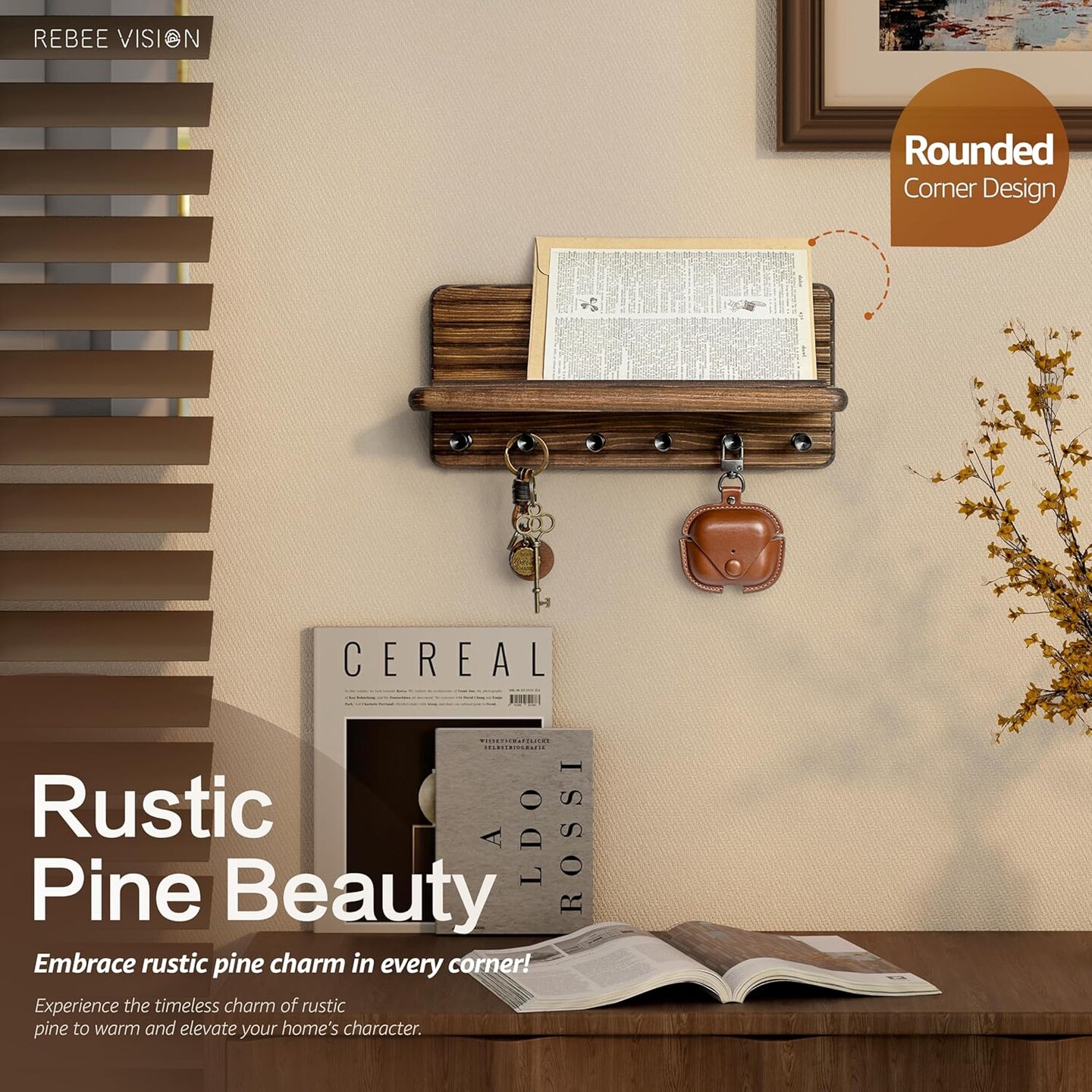 Farmhouse Key Holder Wall Mount for Home Decor – Decorative Pine Wooden Key Holder for Wall with 6 Hooks & Floating Shelf - Rustic Charm for Room Decor Aesthetic (Brown)