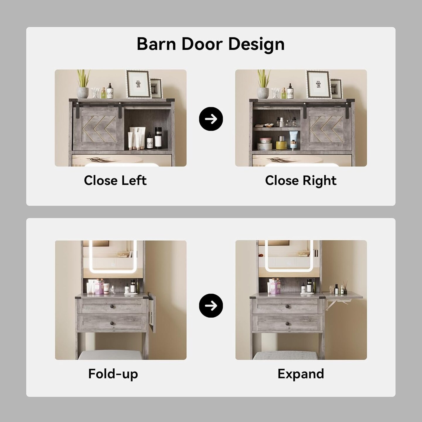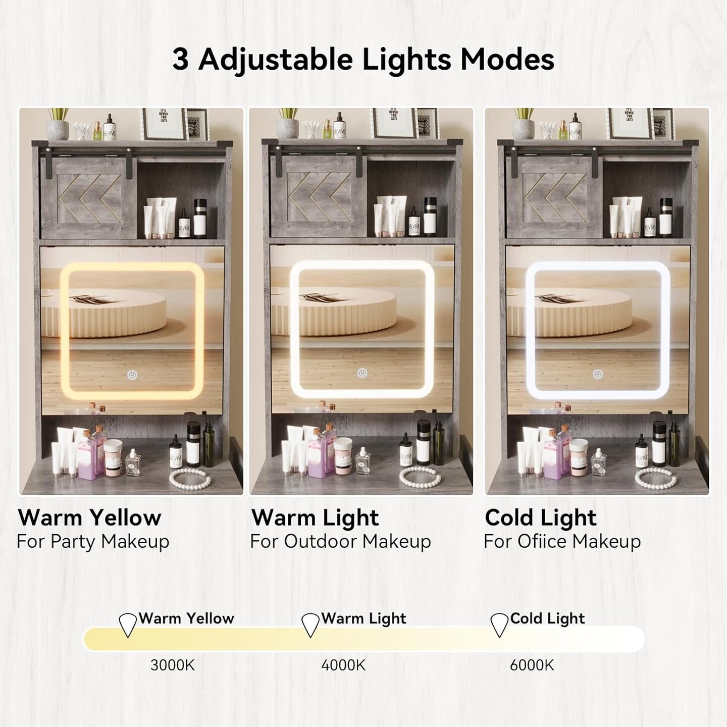 Farmhouse Small Vanity Desk Set with Mirror Cabinet Compact Makeup Vanities Set with 3 Adjustable Lights and Storage Chair for Compact Space, Gray Dressing Table with Fold-up Panel