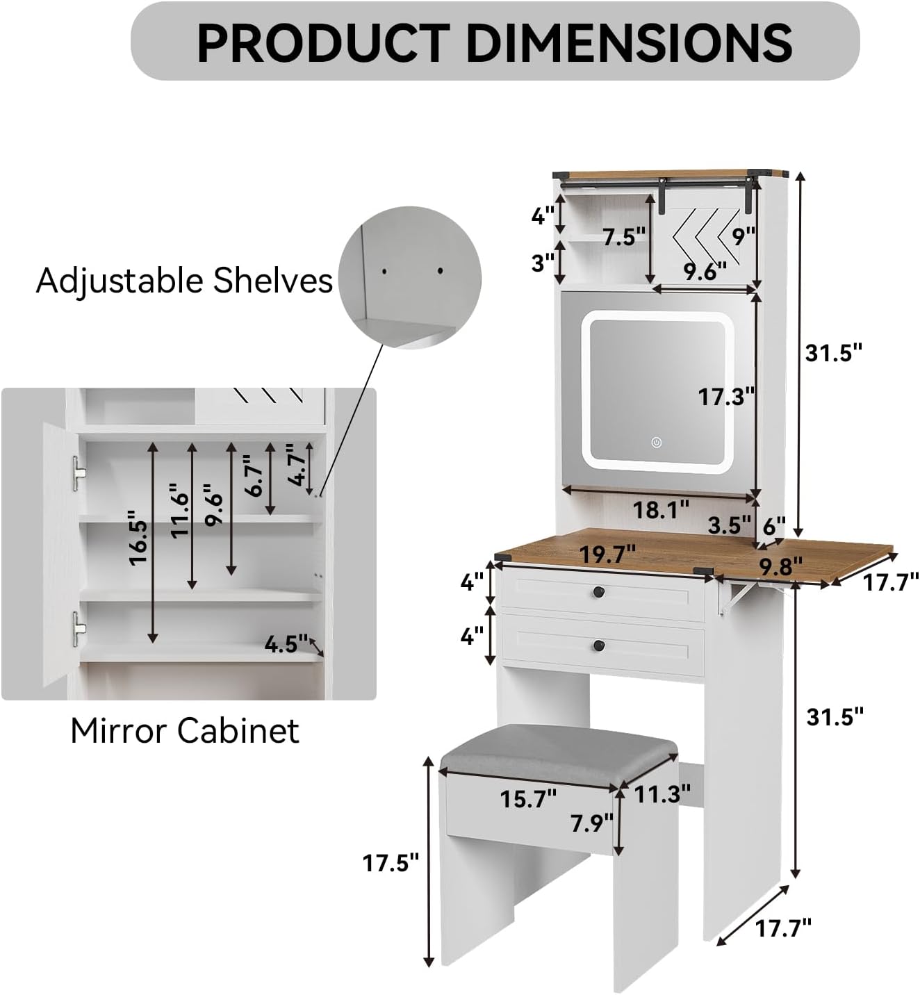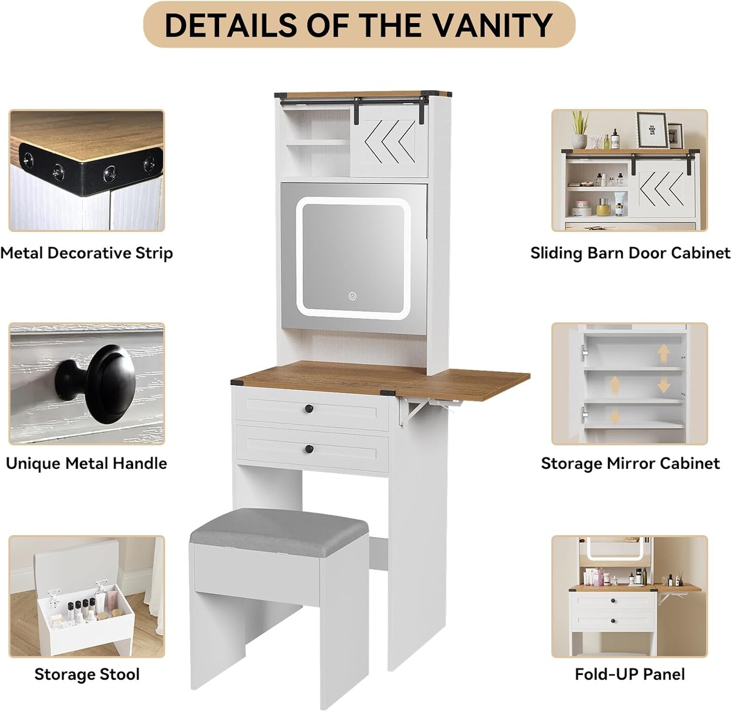 Farmhouse Small Vanity Desk Set with Mirror Cabinet Mini Makeup Vanities Set with 3 Adjustable Lights and Storage Chair for Compact Space, White Dressing Table with Fold-up Panel