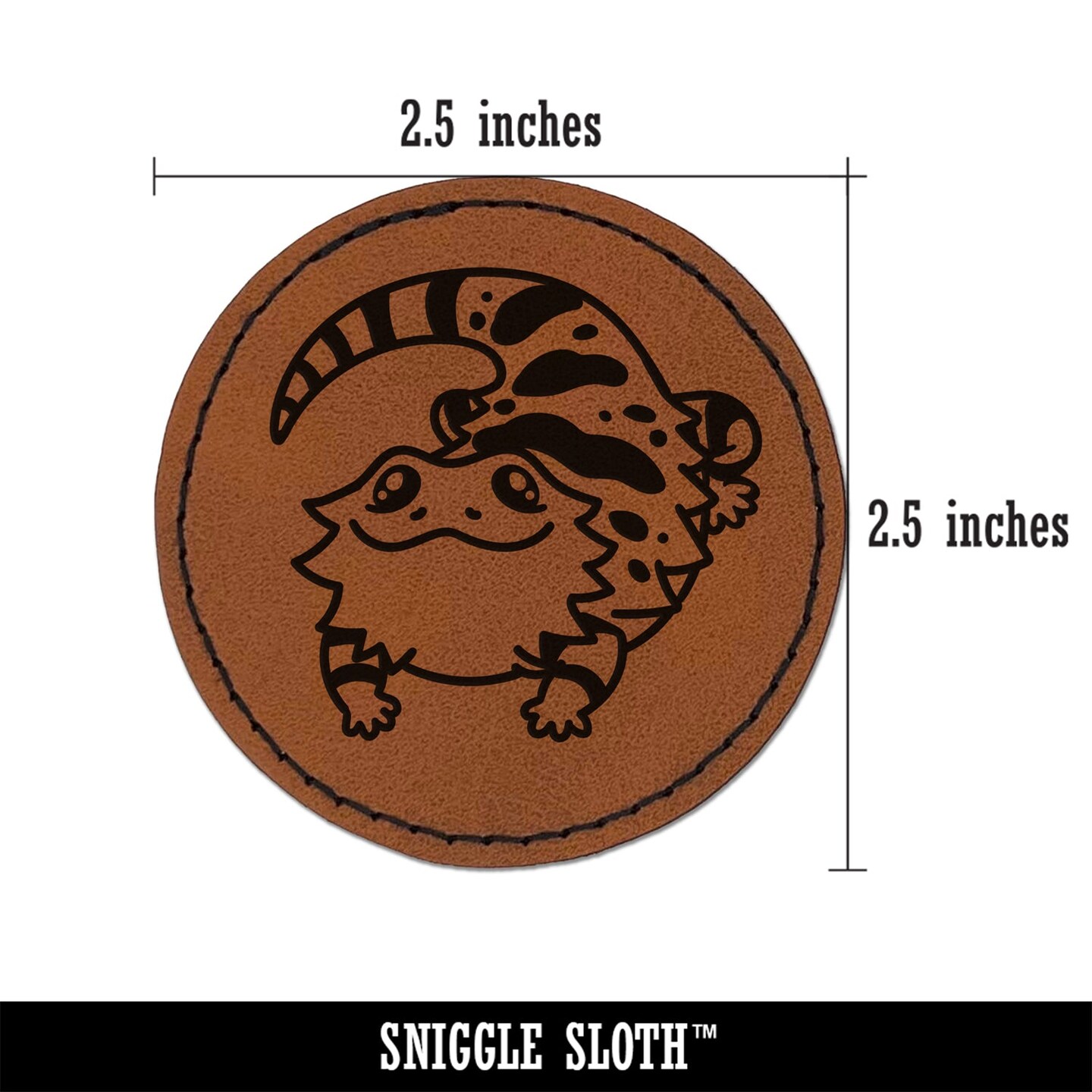 Fat Cute Bearded Dragon Lizard Reptile Round Iron-On Engraved Faux Leather Patch Applique - 2.5"