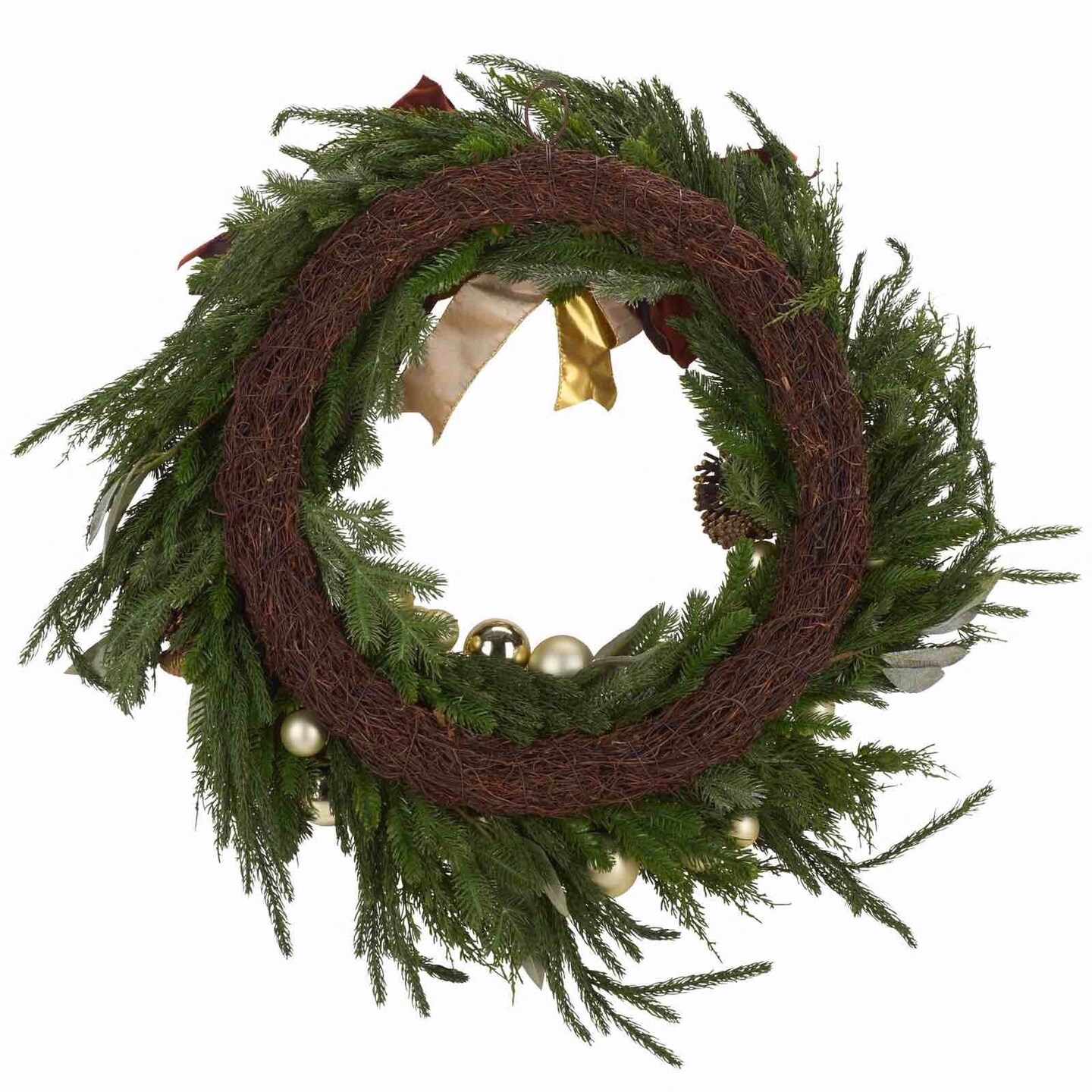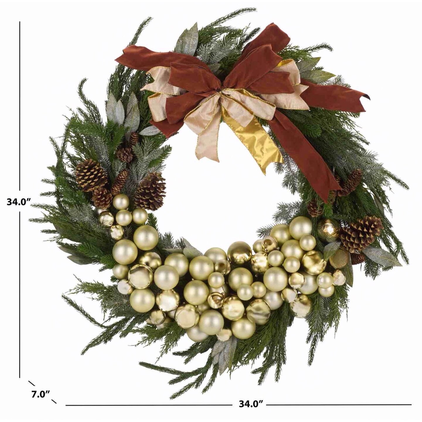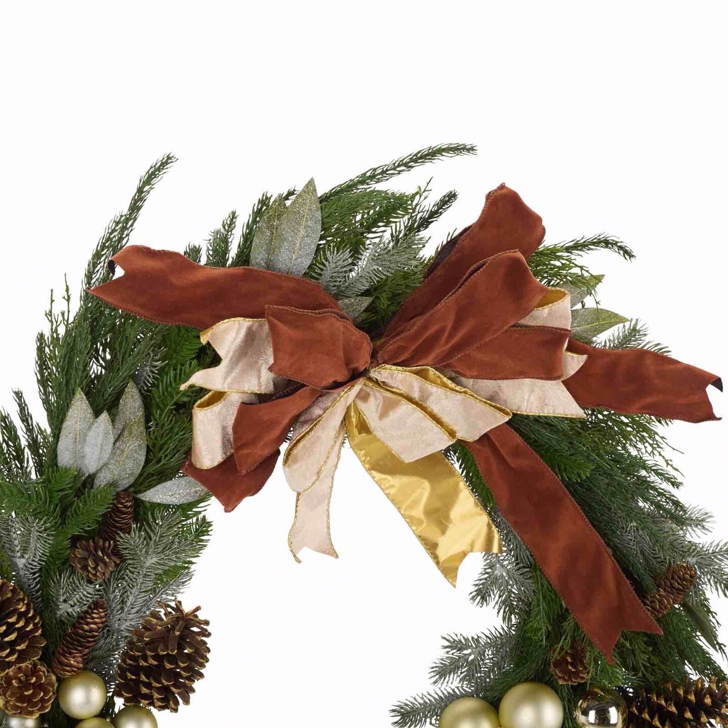 Faux 34 Inch Elegence Pine Needle Wreath W/Ornaments And Ribbon, Pine Cone