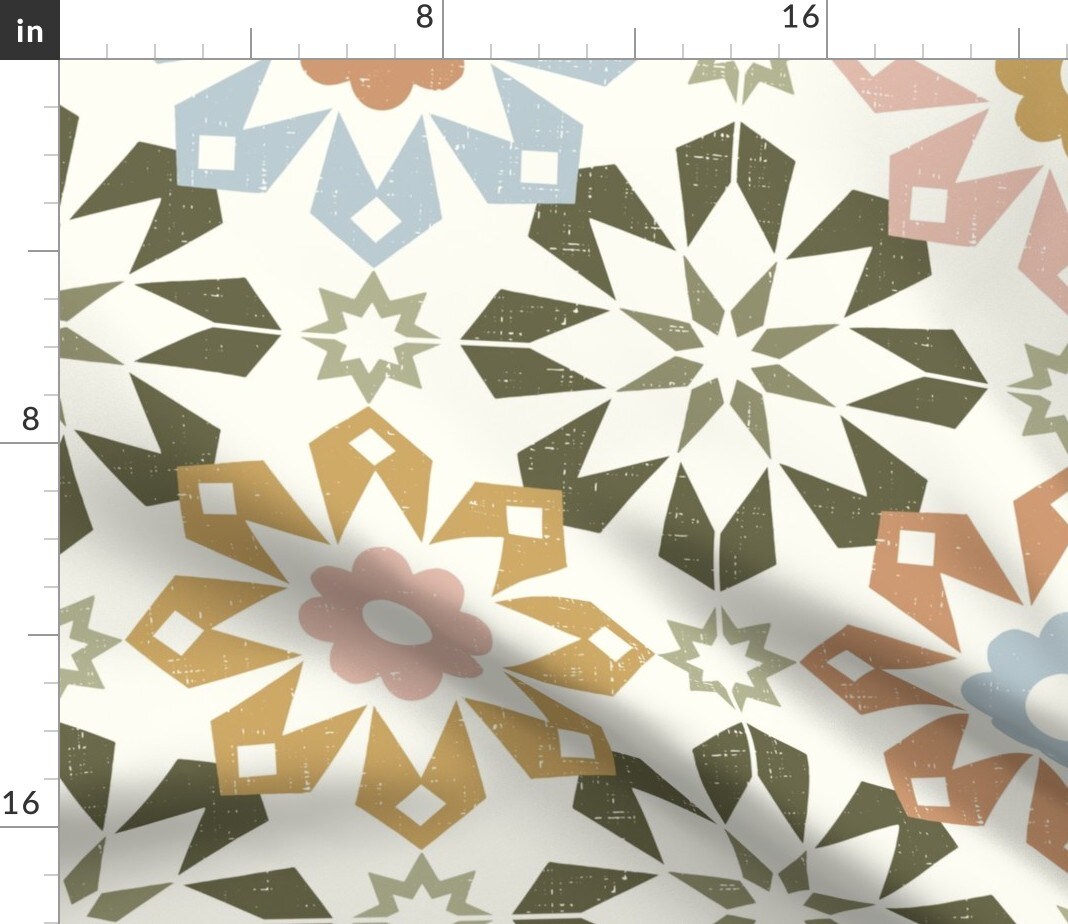 Faux Tile Geometric Modern Bohemian Eclectic Mediterranean Large Scale Earth Tones Distressing Rustic Patchwork Farmhouse Country Kitchen Custom Printed Fabric by Spoonflower Various Fabrics by the Yard or Fat Quarter