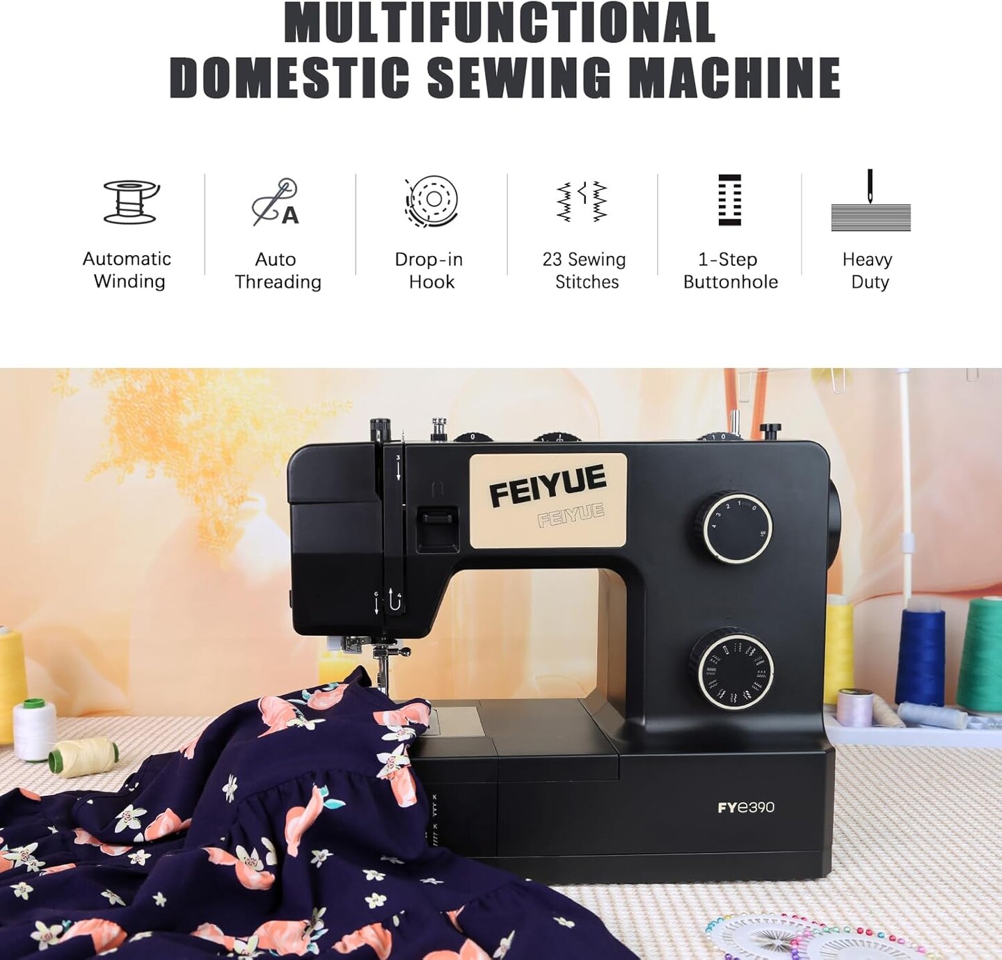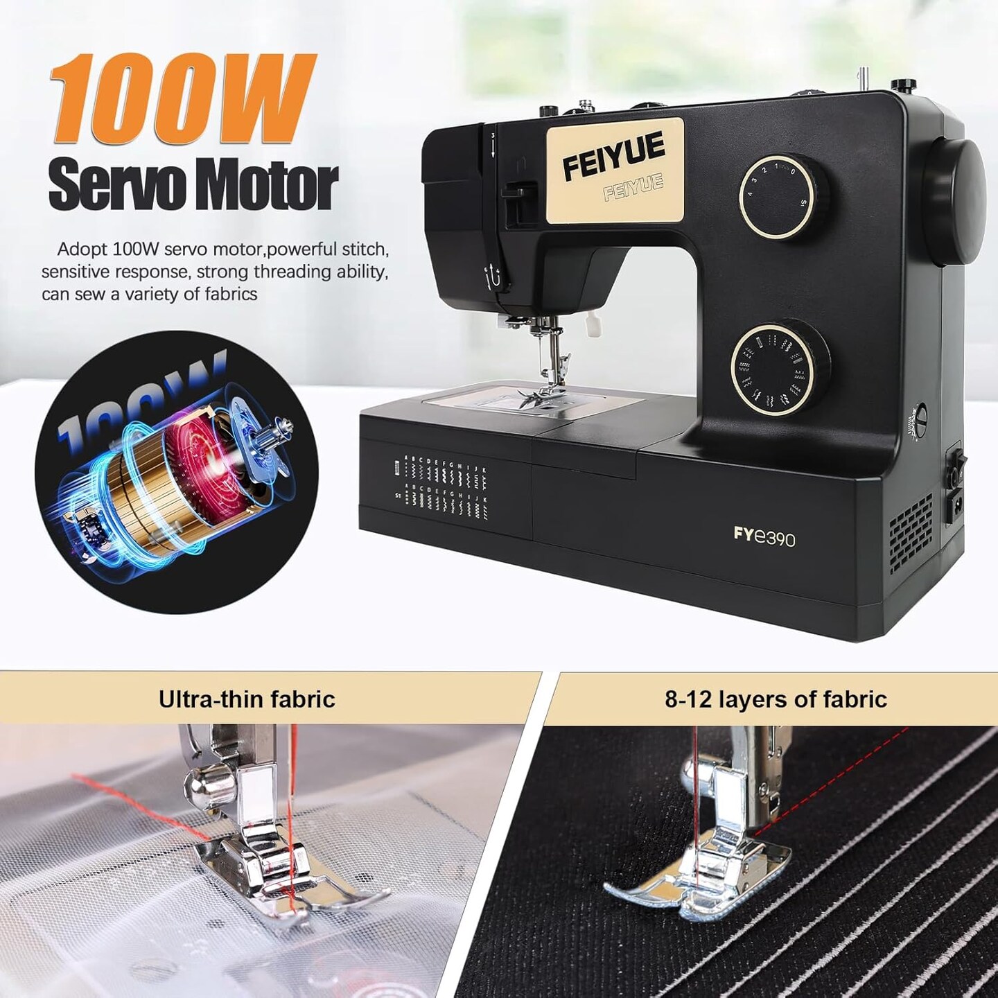 FEIYUE FYe390 Sewing Machine, Energy Saving Servo Motor, Heavy Duty & Portable, 23 Built-in Stitches, Multiple Needle Positions, 6 Bobbins & 5 Included Sewing Feet
