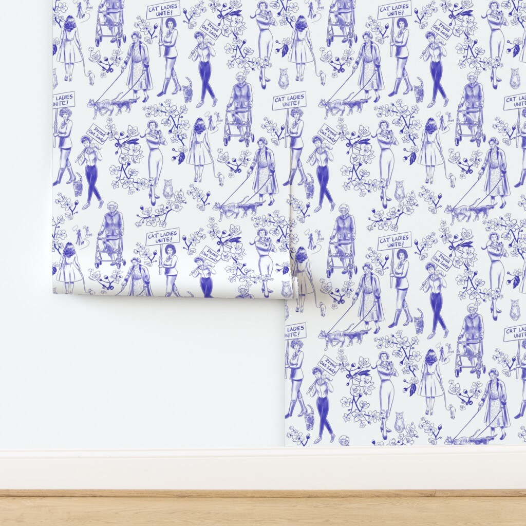 Feminist Cats Women Pets Toile De Jouy Cherry Blossoms Flowers Floral Botanical Novelty Cat Lady Blue And White Animals Preppy Protest March Custom Pre-pasted Wallpaper by Spoonflower Pre-Pasted Wallpaper 2FT Wide