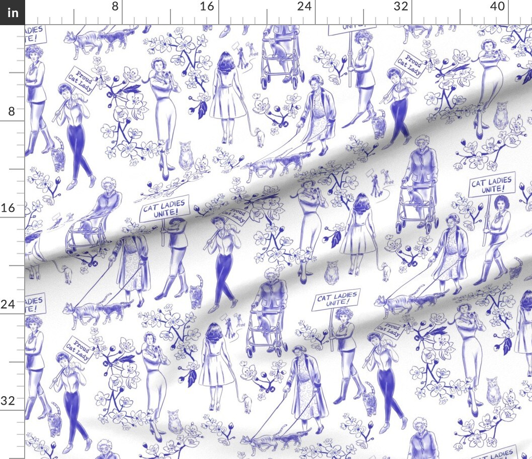 Feminist Cats Women Pets Toile De Jouy Cherry Blossoms Flowers Floral Botanical Novelty Cat Lady Blue And White Animals Preppy Protest March Custom Printed Fabric by Spoonflower Various Fabrics by the Yard or Fat Quarter