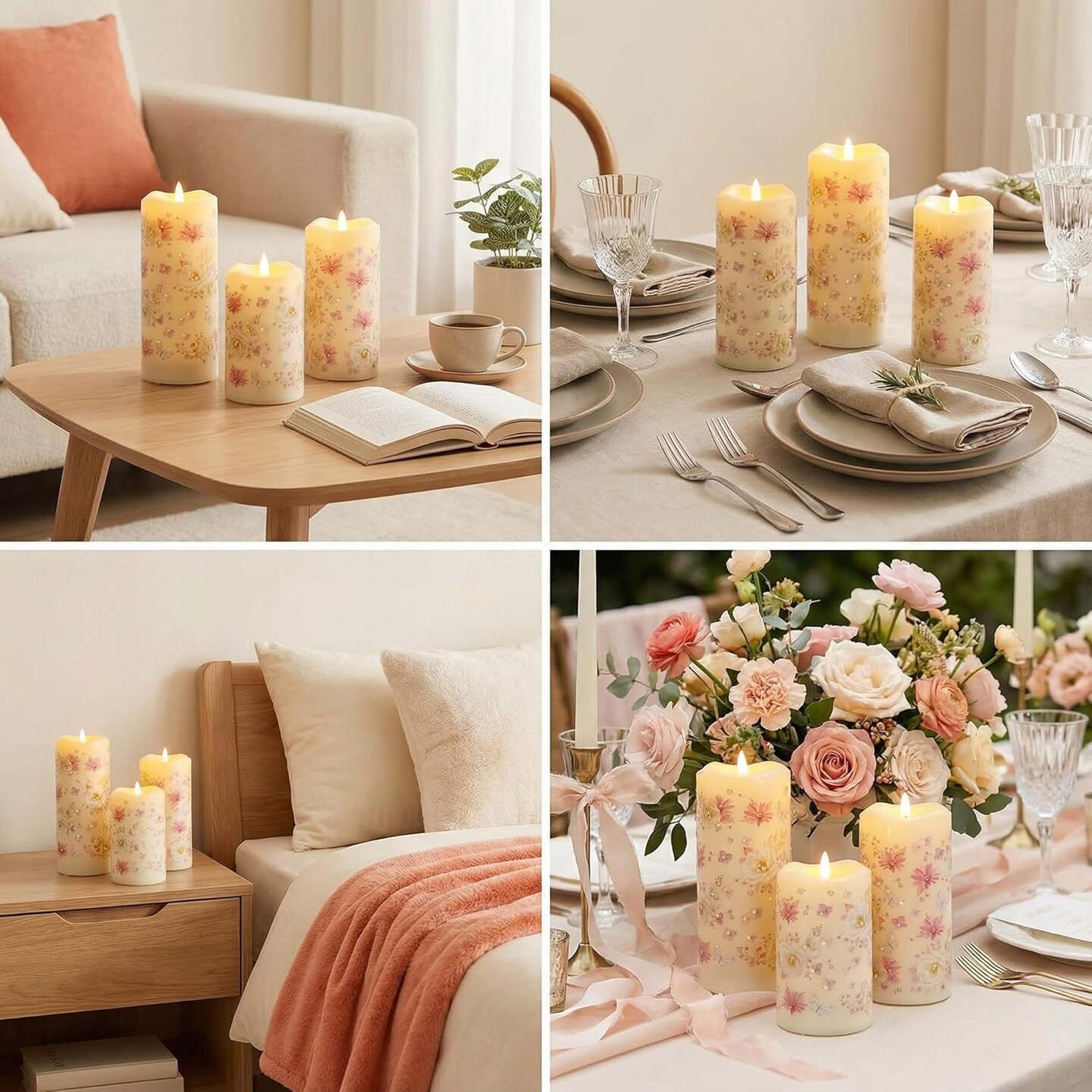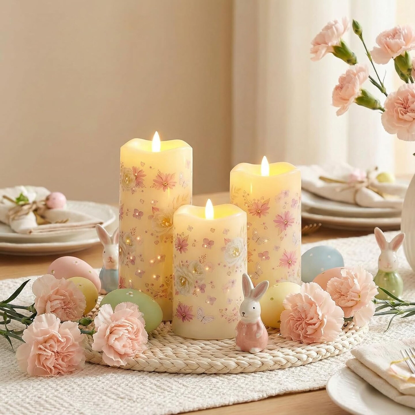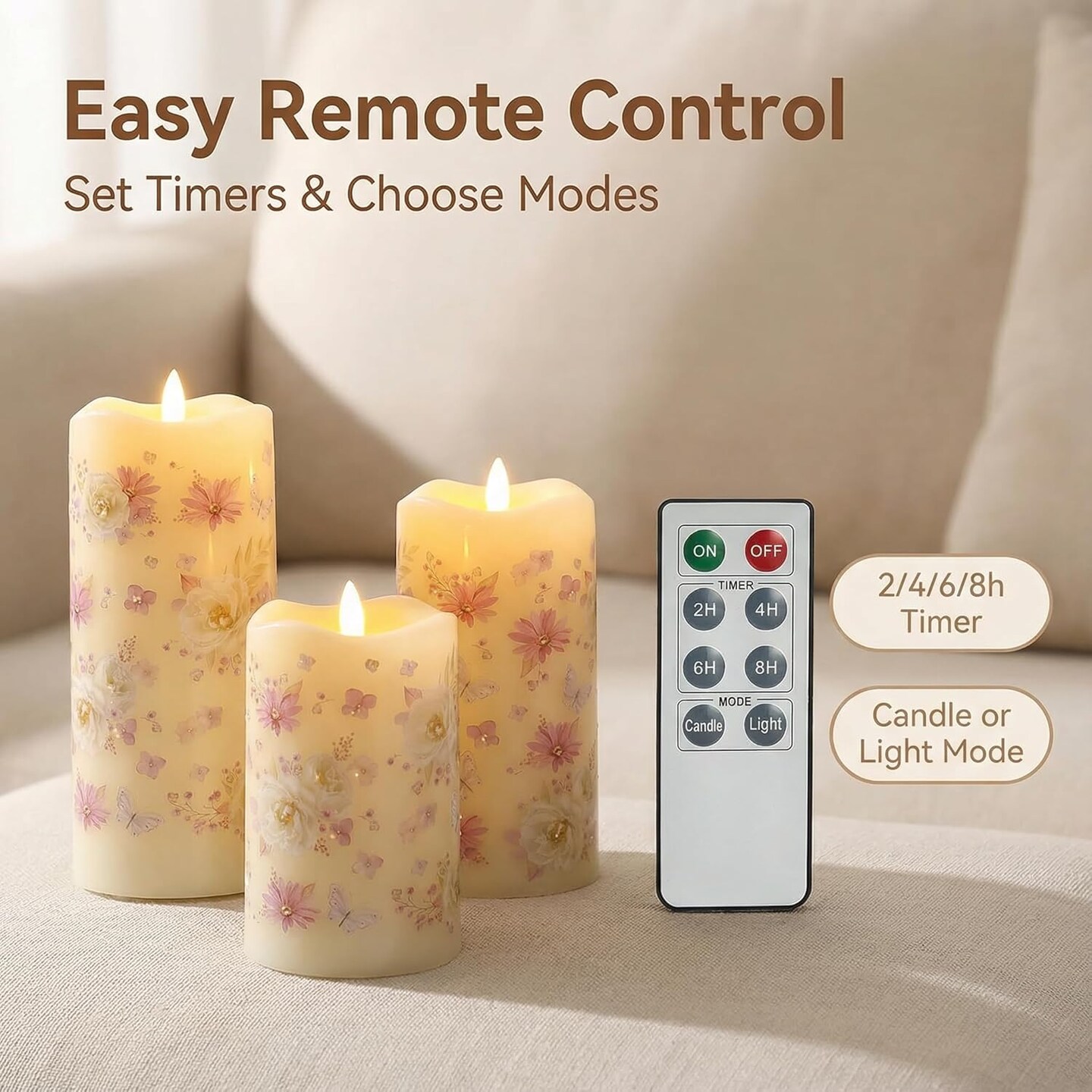 Fiber Optic Flameless Pillar Candles Set of 3 with Remote Floral Butterfly LED Flickering Easter Decor