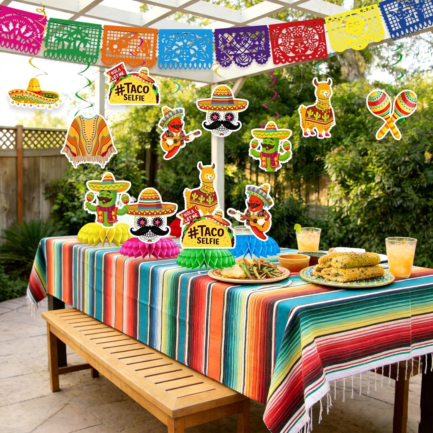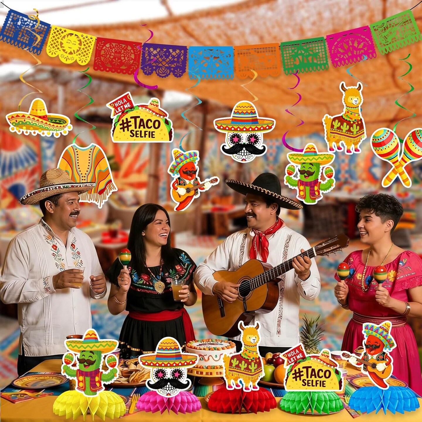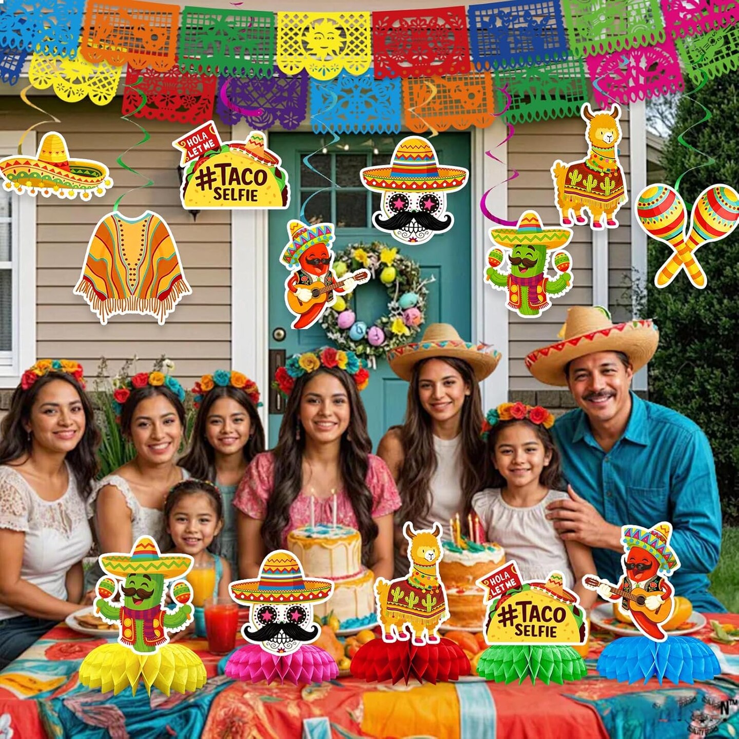 Fiesta Party Decorations Set – Plastic Papel Picado Banner, Hanging Swirls & Honeycomb Centerpieces – Cinco de Mayo Mexican Theme Party Supplies for Taco Party, Birthday & Day of the Dead Decor – Perfect for Mother's Day Card Making Displays
