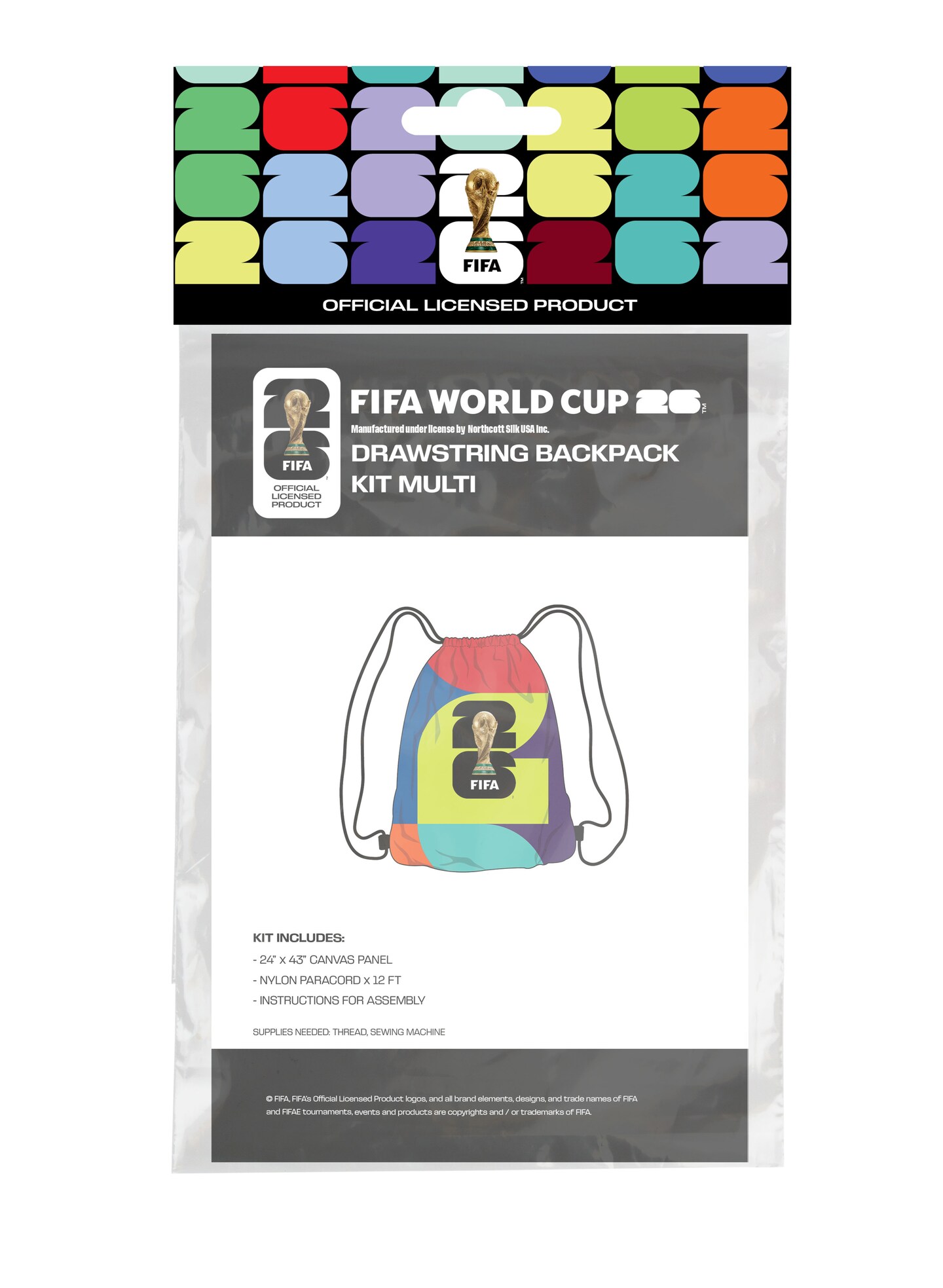 FIFA World Cup DIY Drawstring Backpack Kit – Soccer Fan Sewing Craft Kit – Includes 24" x 43" Multicolor Canvas Fabric Panel, 12ft Nylon Paracord & Instructions – Create a 17" x 13" Sports Bag