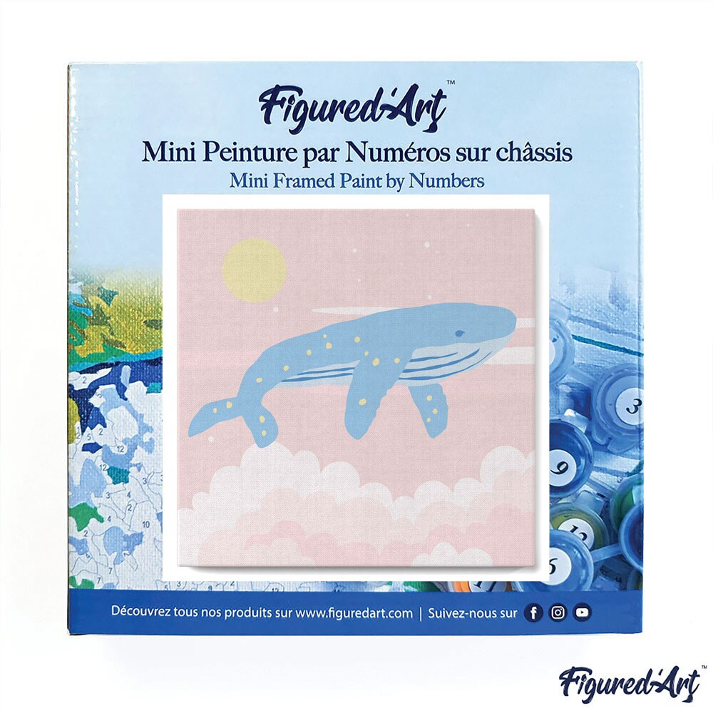 Figured'Art Mini Paint by Numbers Kit for Adults with Frame Pastel Flying Whale Small format 8"x8" - Craft Art Painting DIY Canvas Already Stretched on a Wooden Frame