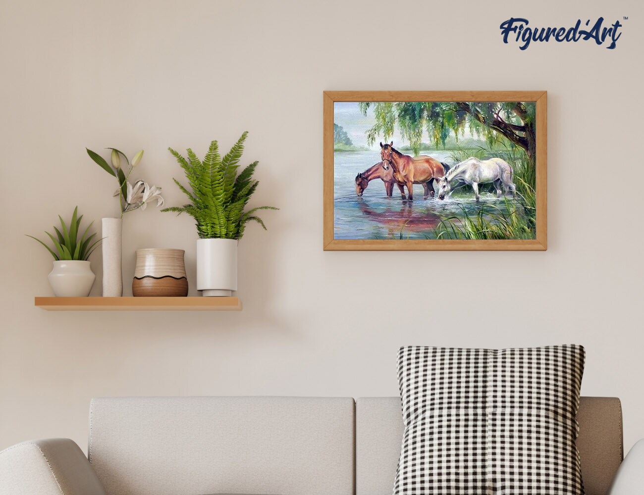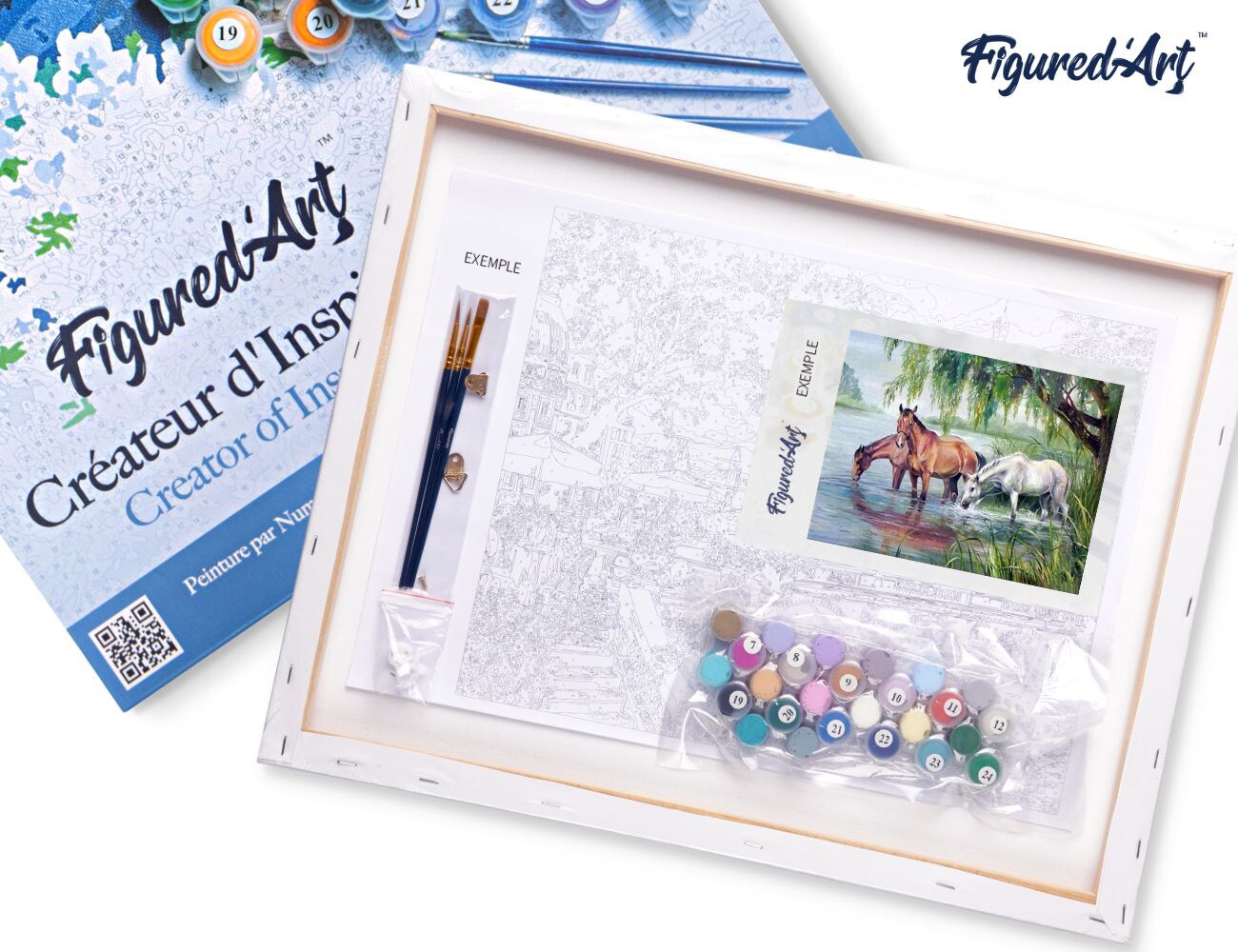 Figured'Art Paint by Numbers for Adults with Frame Three Horses near the lake 16"x20" - Craft Art Painting DIY Kit Canvas Already Stretched on a Wooden Frame