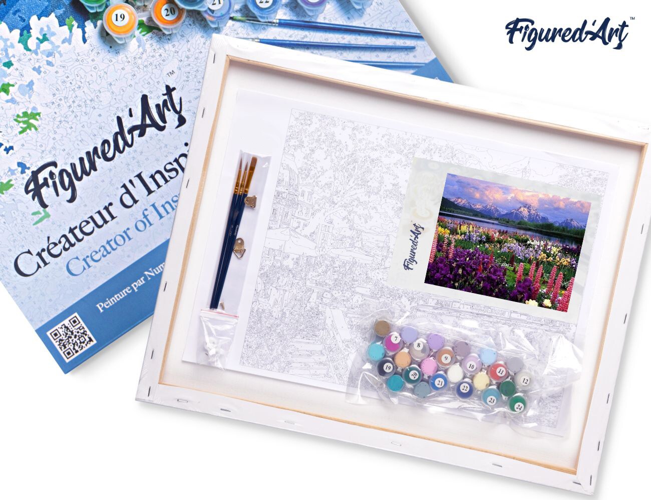 Figured'Art Paint by Numbers Kit for Adults with Frame Flowers and Lake near the Mountain 16"x20" - Craft Art Painting DIY Kit Canvas Already Stretched on a Wooden Frame