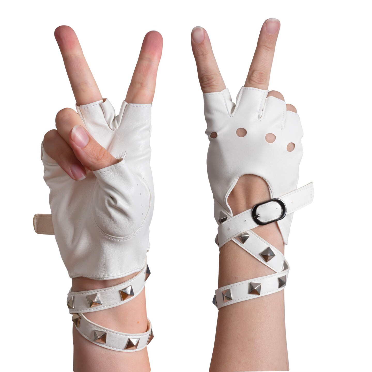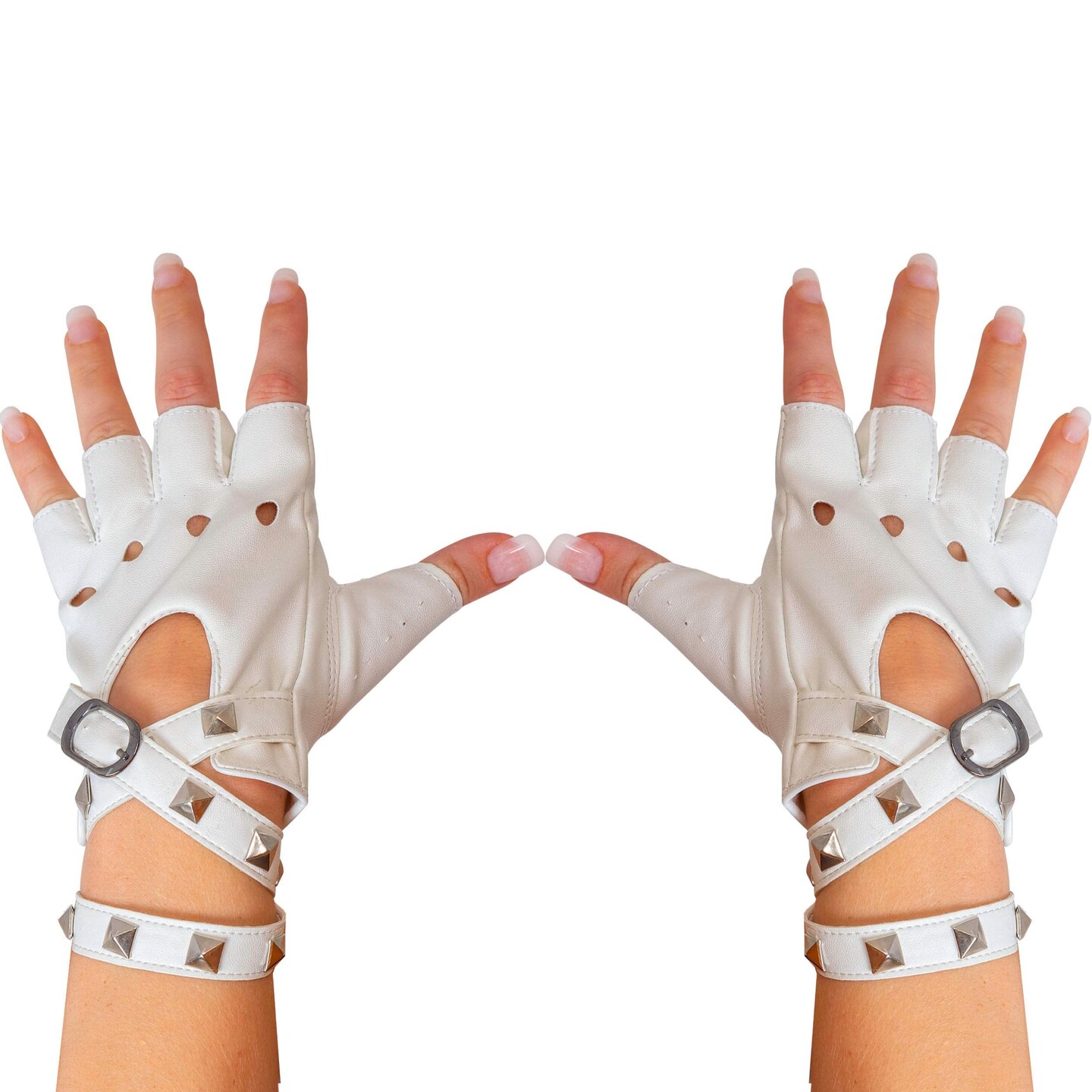 Fingerless Faux Leather Gloves - White Biker Punk Gloves with Belt Up Closure and Rivet Design for Women and Kids