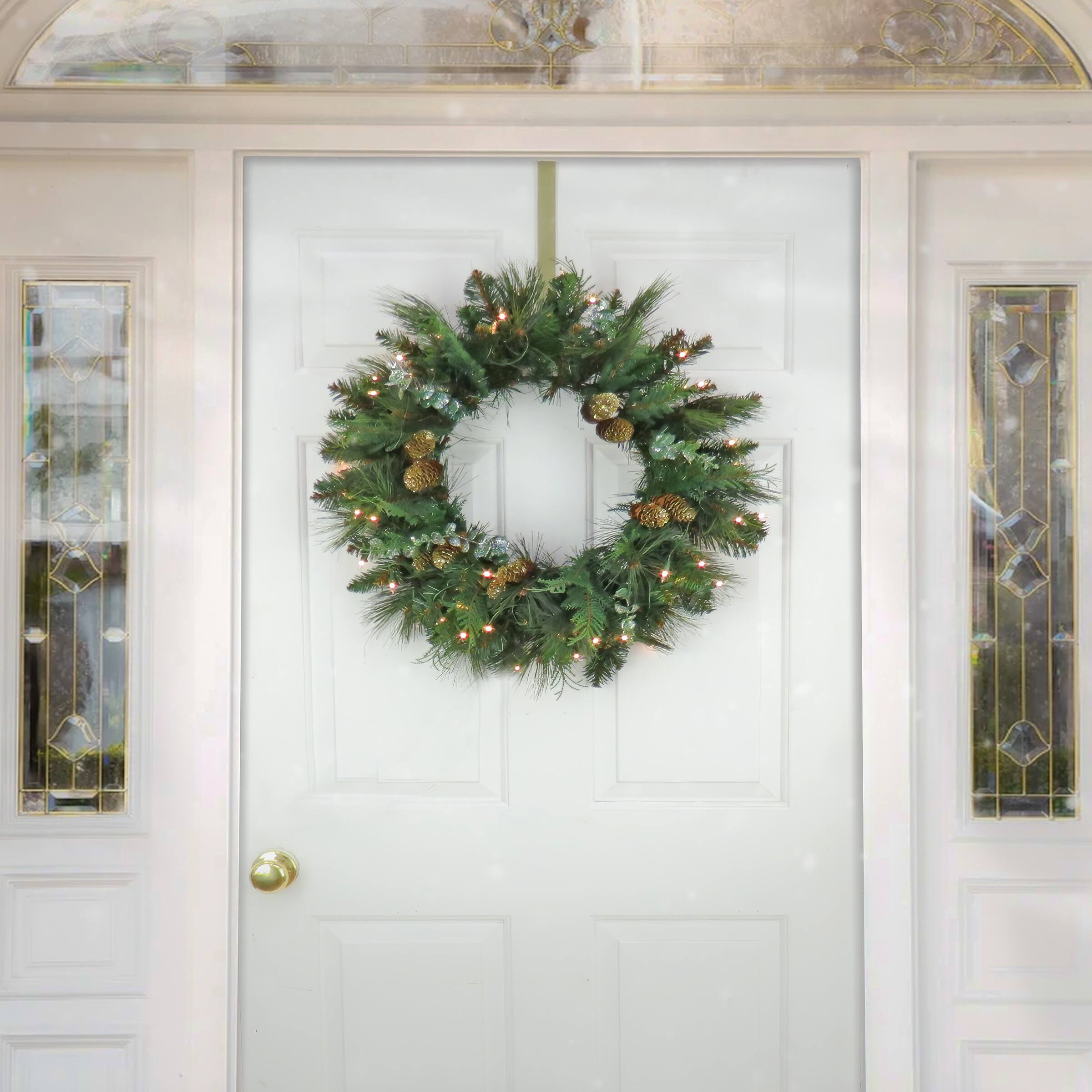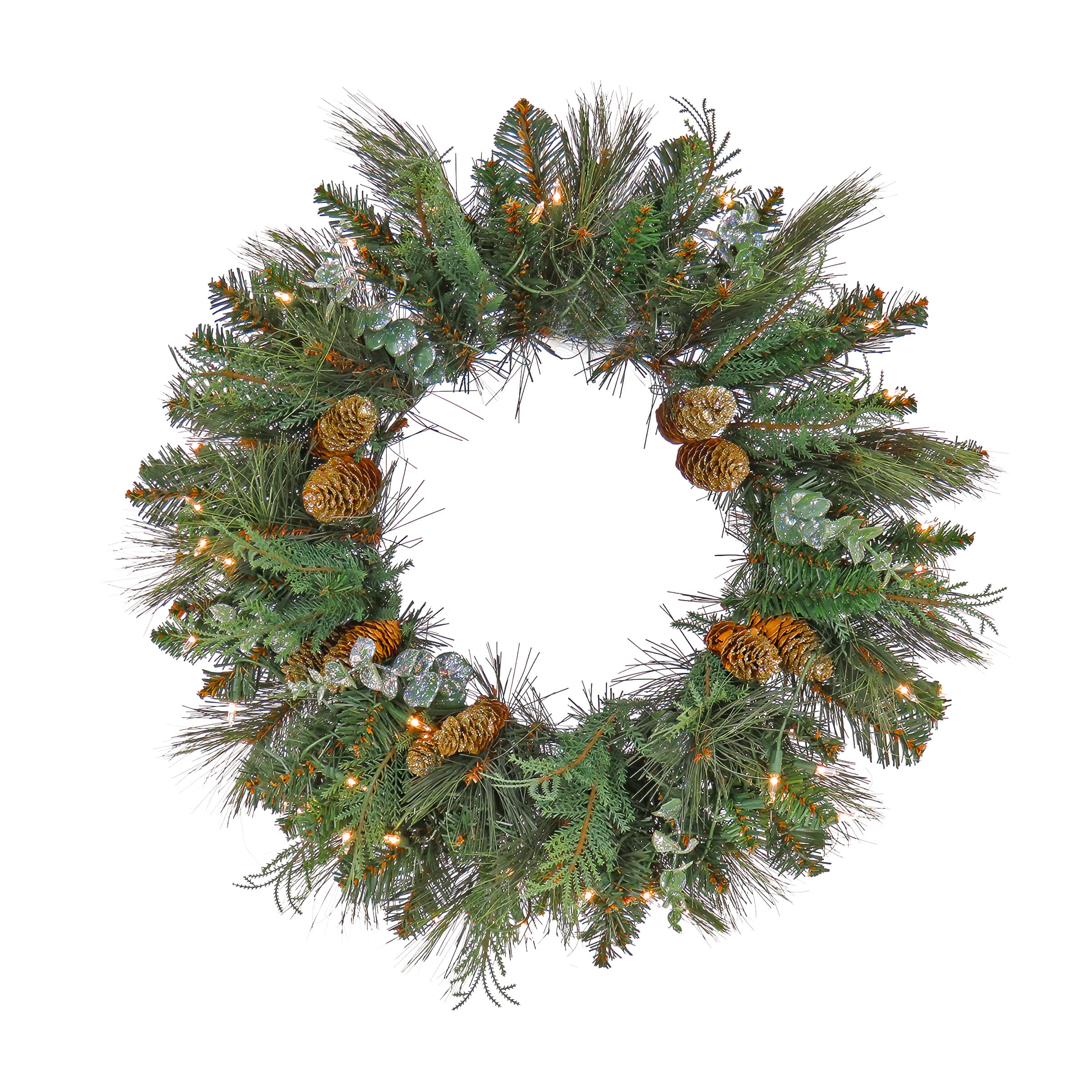 First Traditions™ 24'' Pre-Lit Artificial North Conway Wreath with Glittery Cones and Eucalyptus