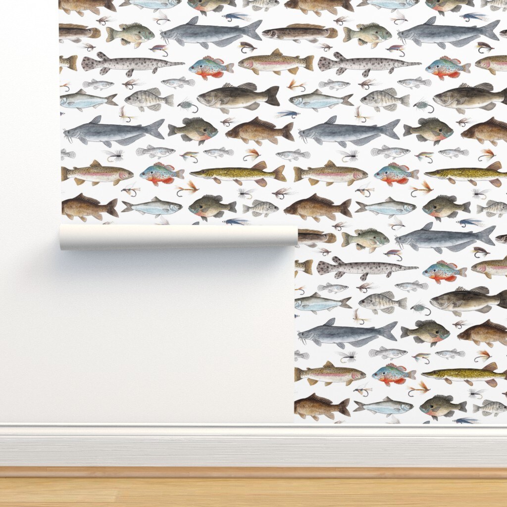 Fish Fishing Salmon Cabin Trout Fisherman Lures Sunfish Tackle Stream Muskie Sturgeon Custom Removable Wallpaper by Spoonflower Peel & Stick Wallpaper 2FT Wide 14884713