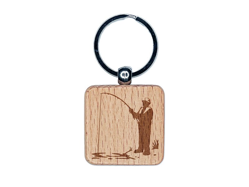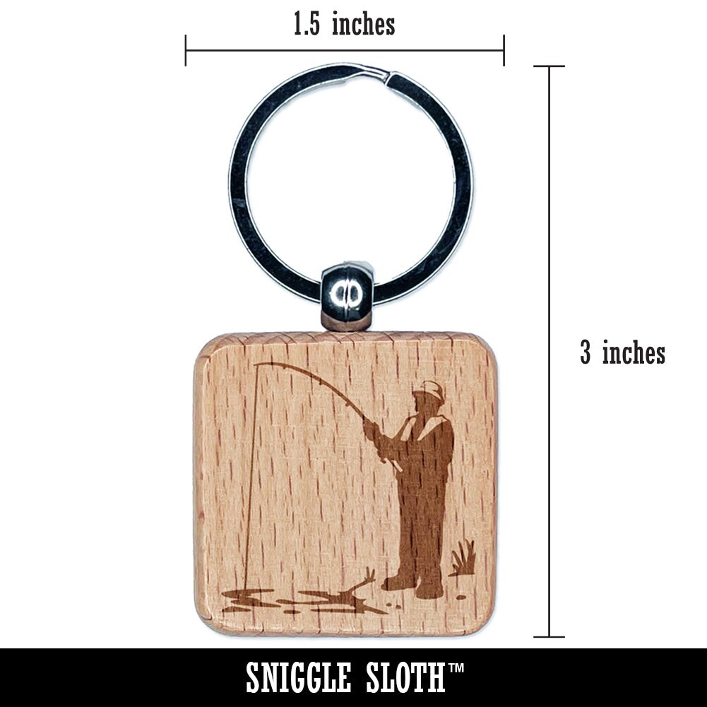 Fisherman with Rod Over Water Engraved Wood Square Keychain Tag Charm