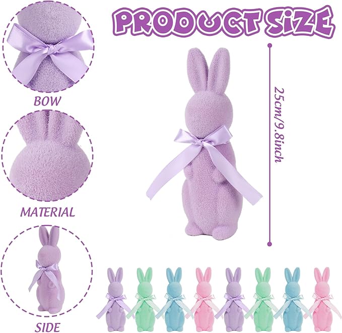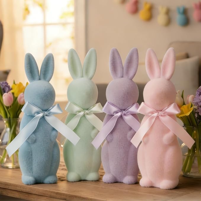 Flocked Bunny Easter Decorations Pastel Rabbit Figurines with Bow for Spring Easter Home Office Party Table Centerpiece Decoration, 4 Pcs