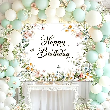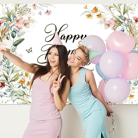 Floral Birthday Backdrop for Girls Spring Butterfly Happy Birthday Photography Background Greenery Wildflower Birthday Banner 70.8 x 43.3 Inch
