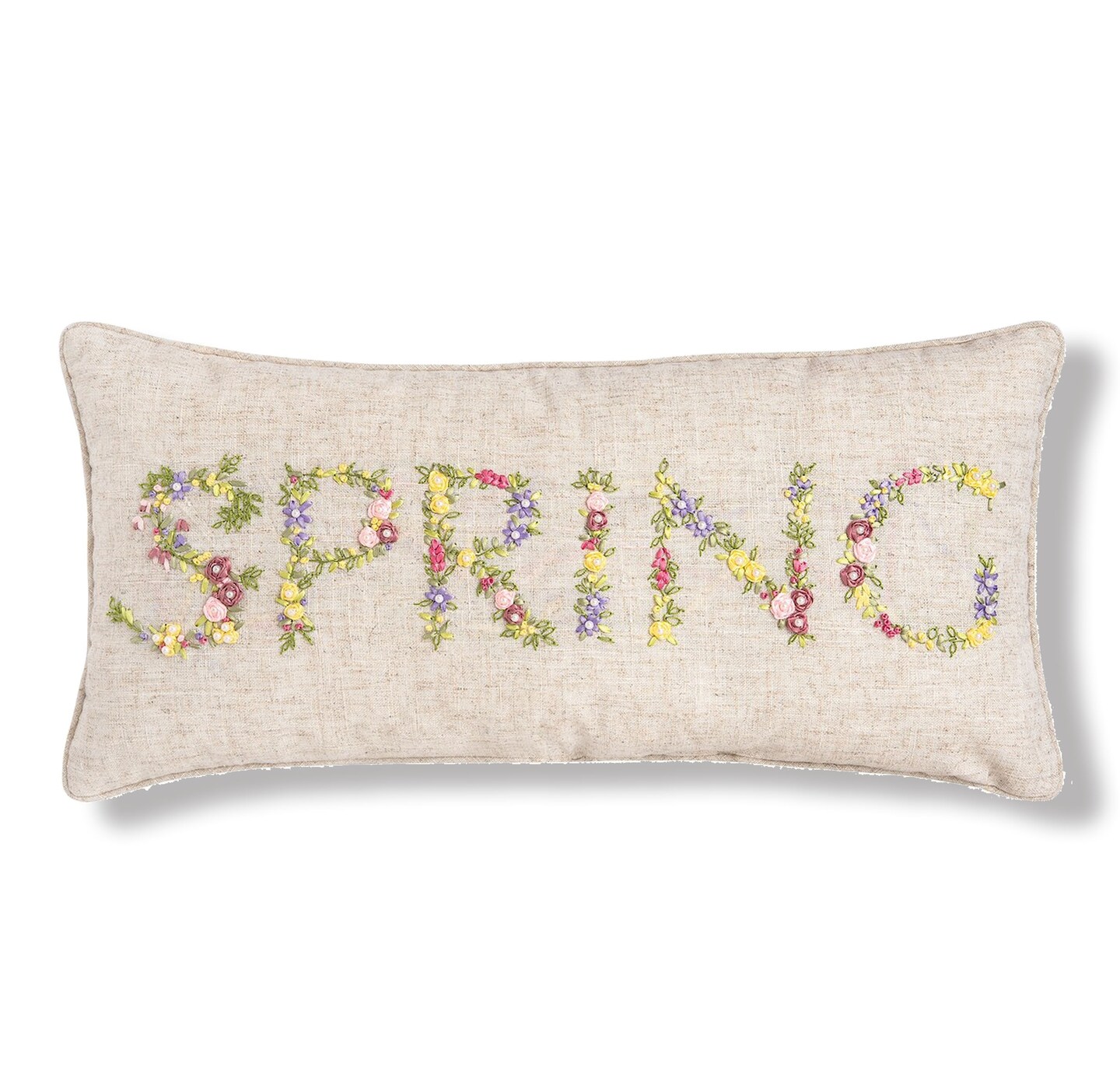 Floral Flower Font "Spring" Embroidered Ribbon Art Accent Pillow, 12" x 24"