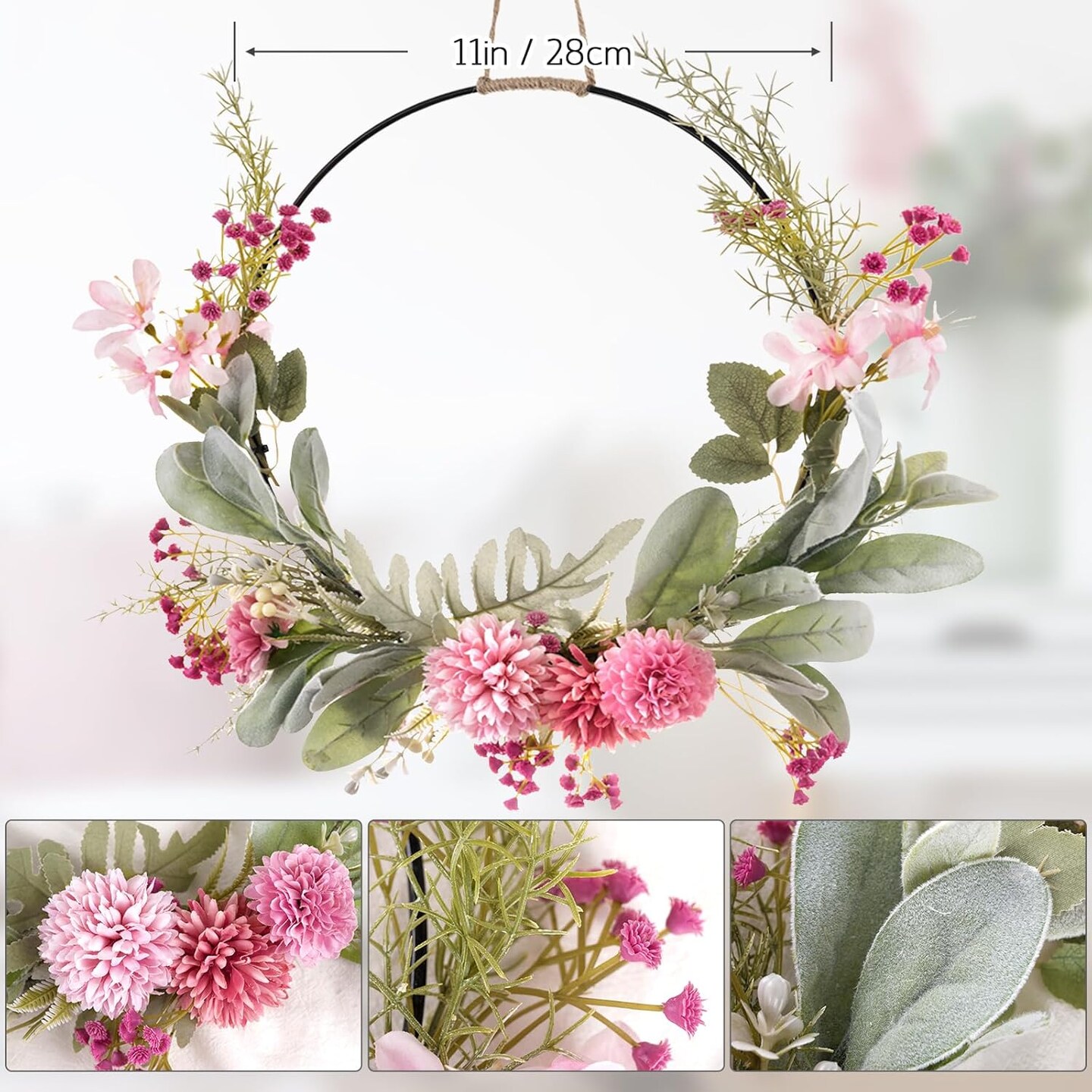 Floral Hoop Wreath Decor with Purple Spring Flowers Green Leaves