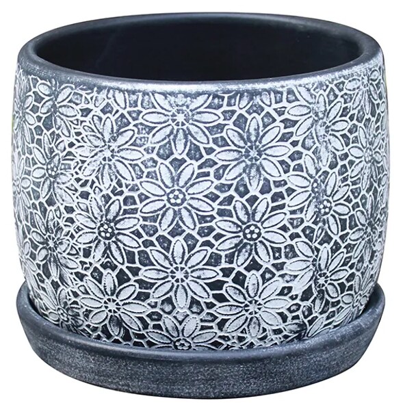 Floral Lace Stamp Planter with Attached Saucer - 5.5" x 4.5" - Black