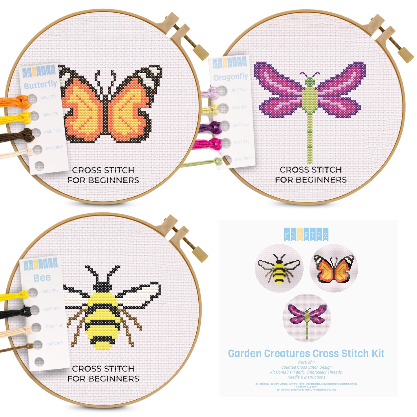 Floral Stamped Cross Stitch Kits for Beginners - 3 Pack. DIY Embroidery Needlepoint Patterns for Adults. Easy Cross Stitch Kits for Beginners (Garden Creatures)