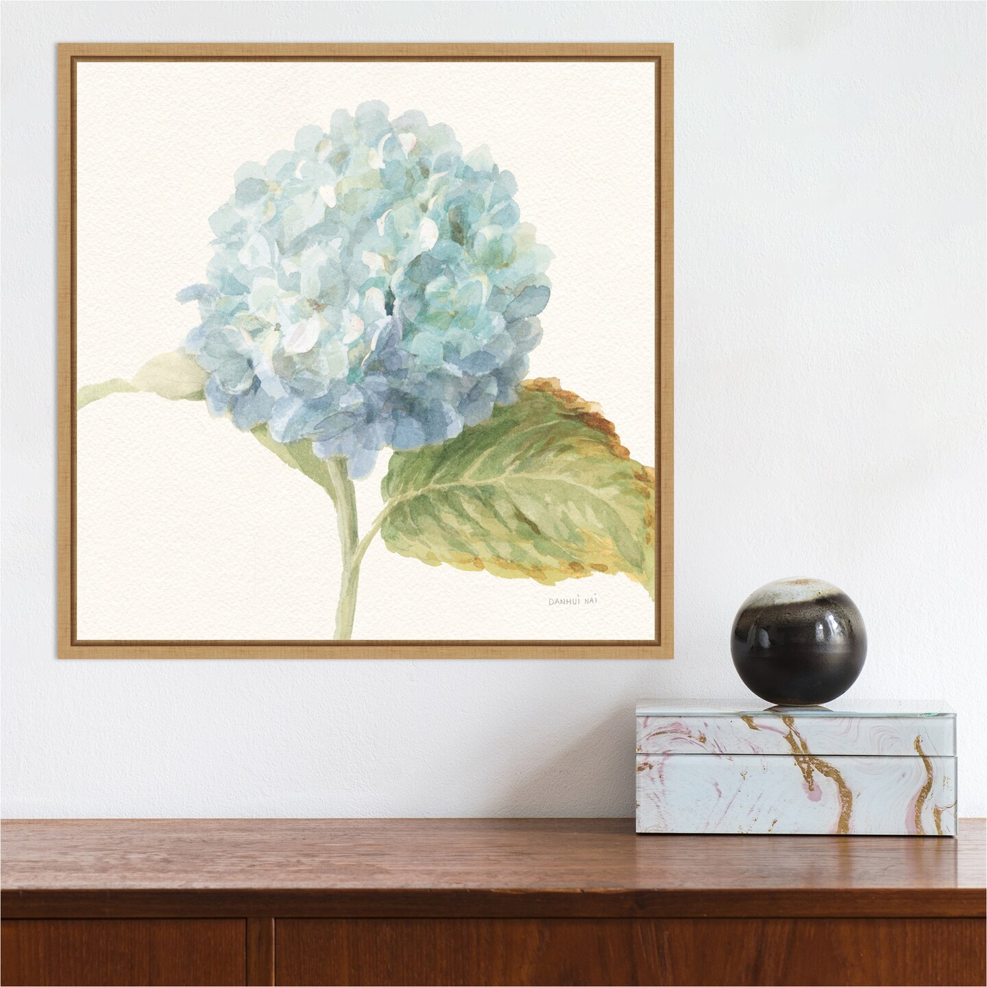 Floursack Florals V Blue Hydrangea Crop by Danhui Nai 16-in. W x 16-in. H. Canvas Wall Art Print Framed in Natural