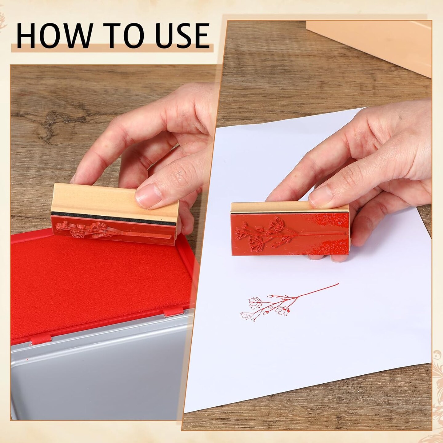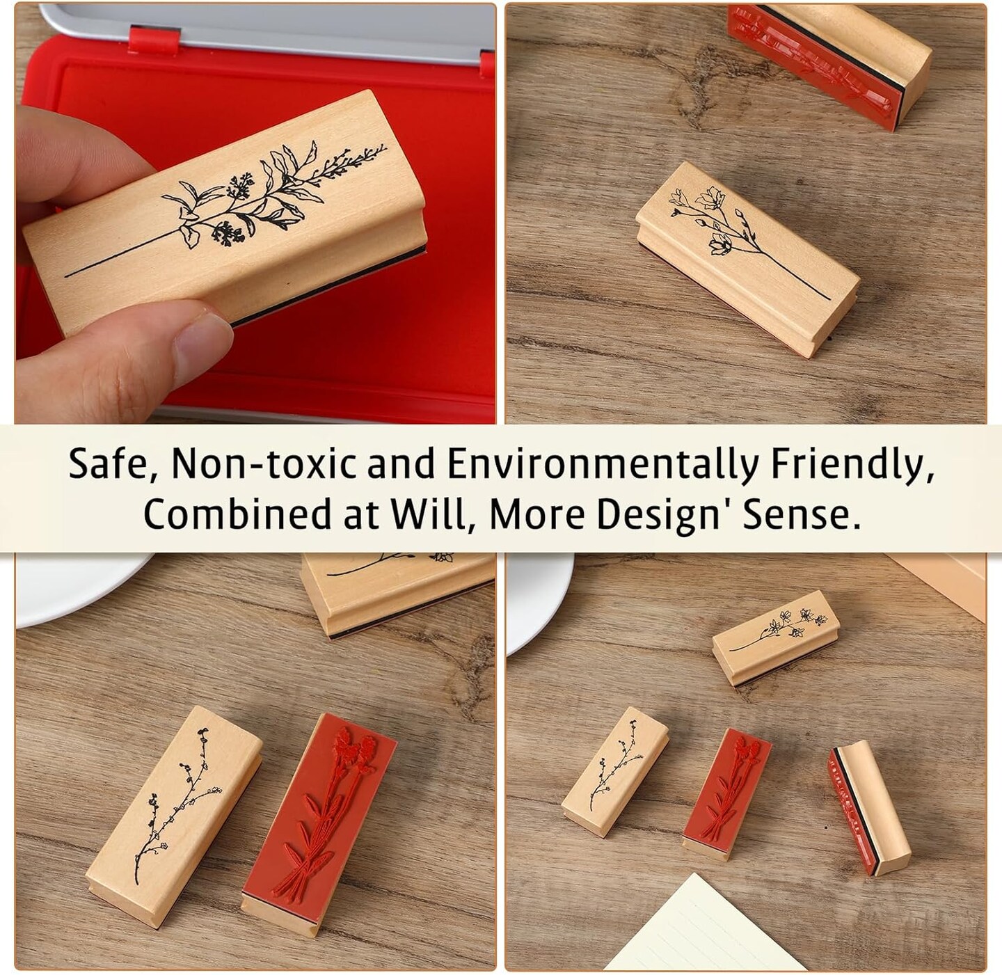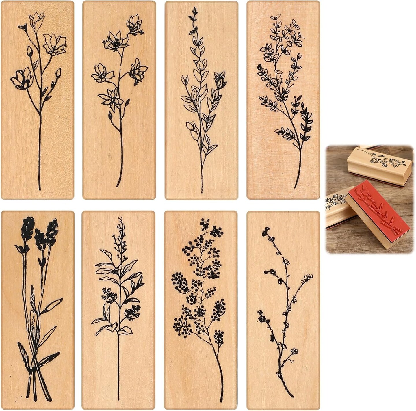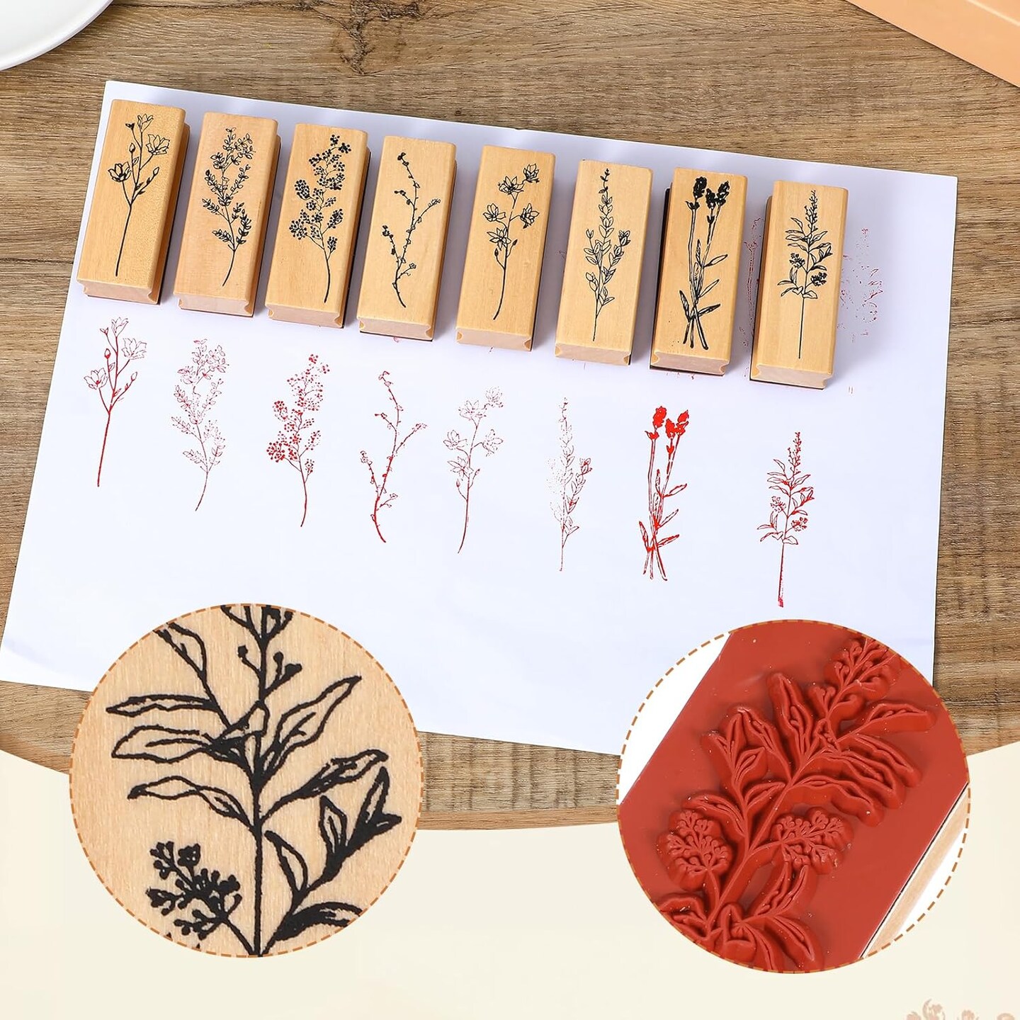 Flower and Plant Shape Wooden Rubber Stamps, 8Pcs Vintage Mounted Stamps 2.6x1x0.8 Inch Decorative Rubber Stamps