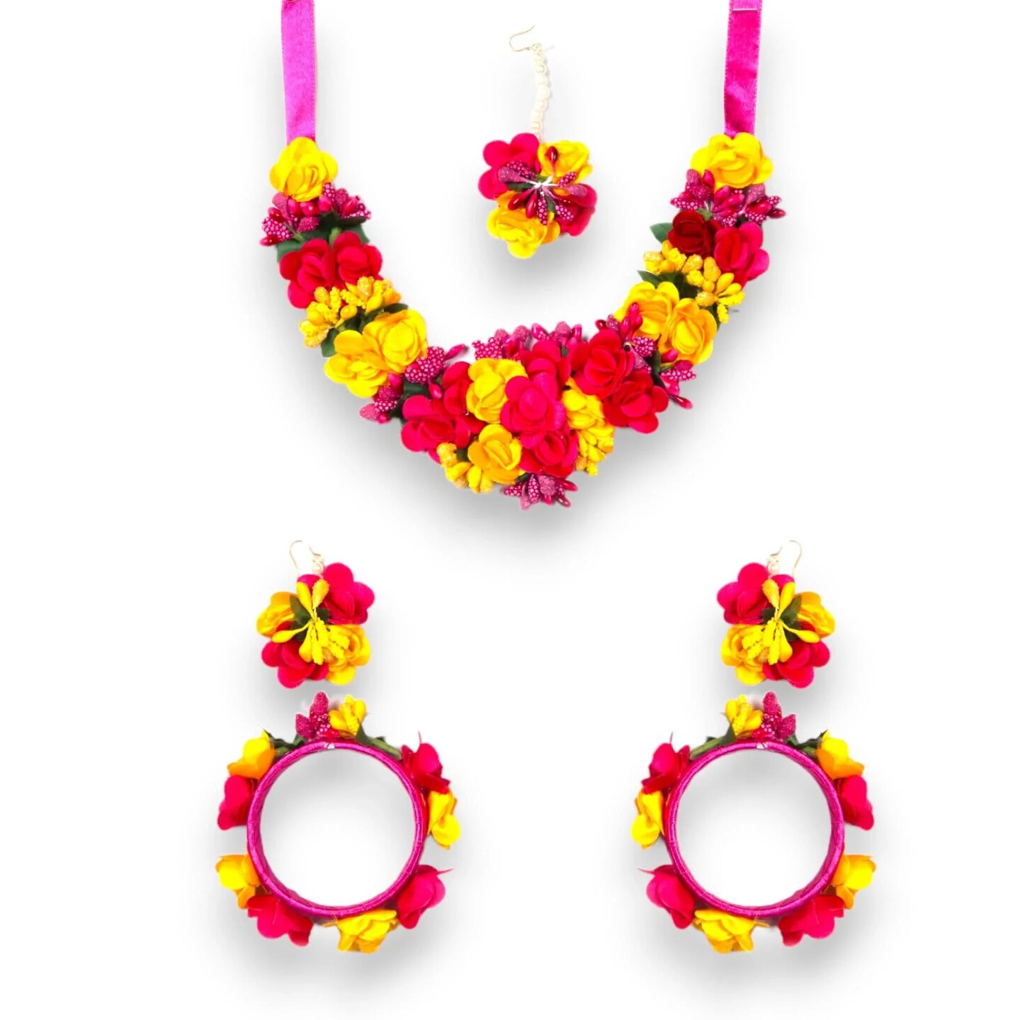 Flower Designer Jewelry Set for Women Handmade Necklace with Earrings Maang Tikka Bracelets Indian Artificial Jewellery for Haldi Mehndi Wedding Party Bridal