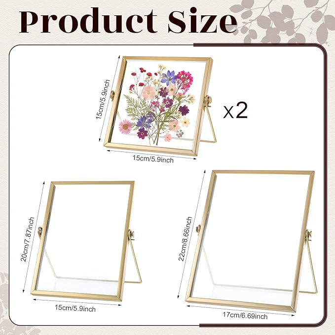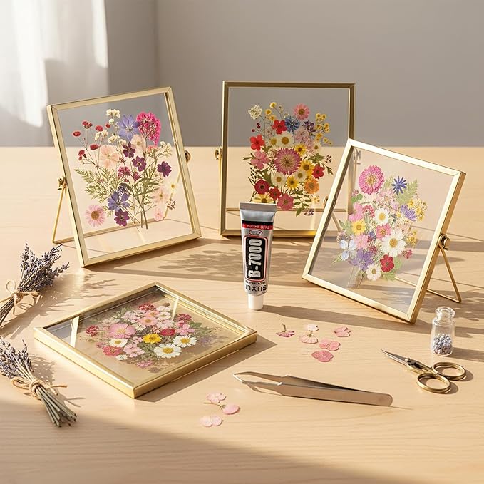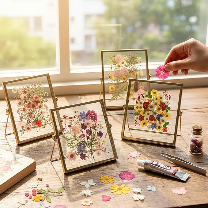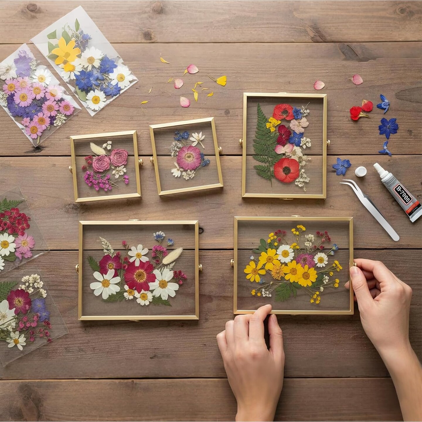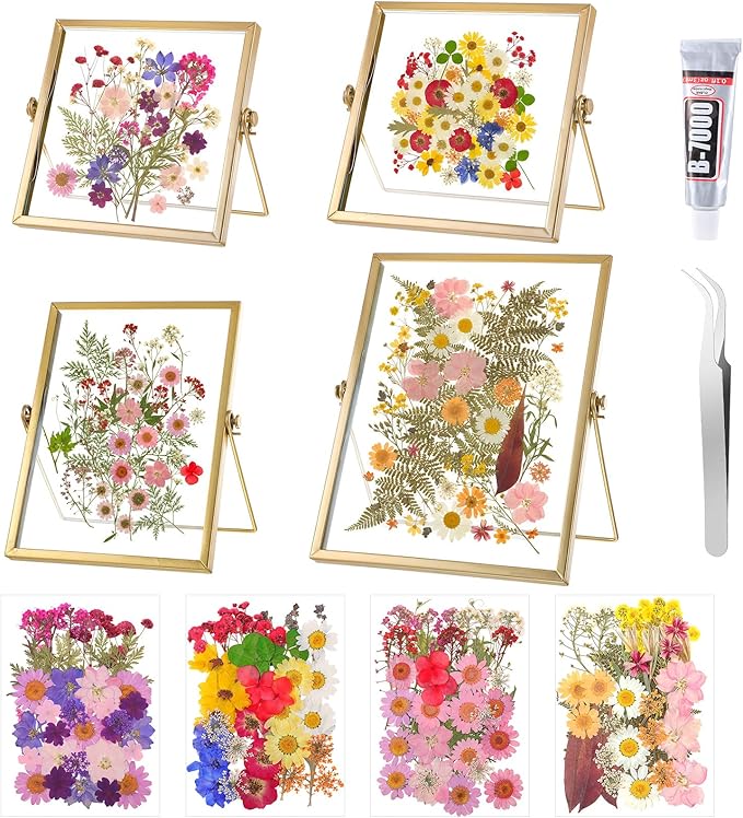 Flower Frame Pressed Kit, Include 4 Pcs Gold Metal Picture Frames and 140 Pcs Dried Pressed Flowers for Crafts DIY Floating Photo Frame for Tabletop Display, Home Decor, Gifts