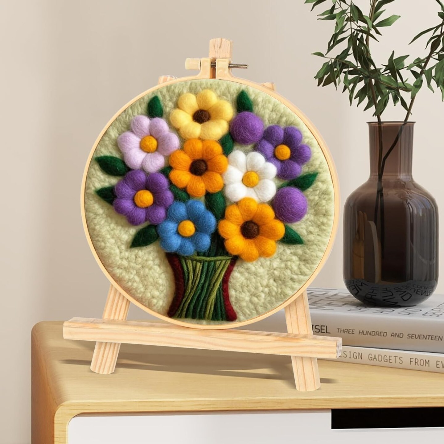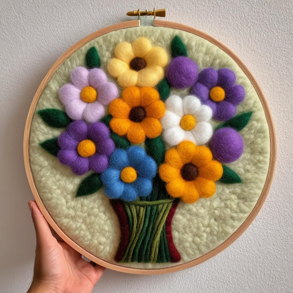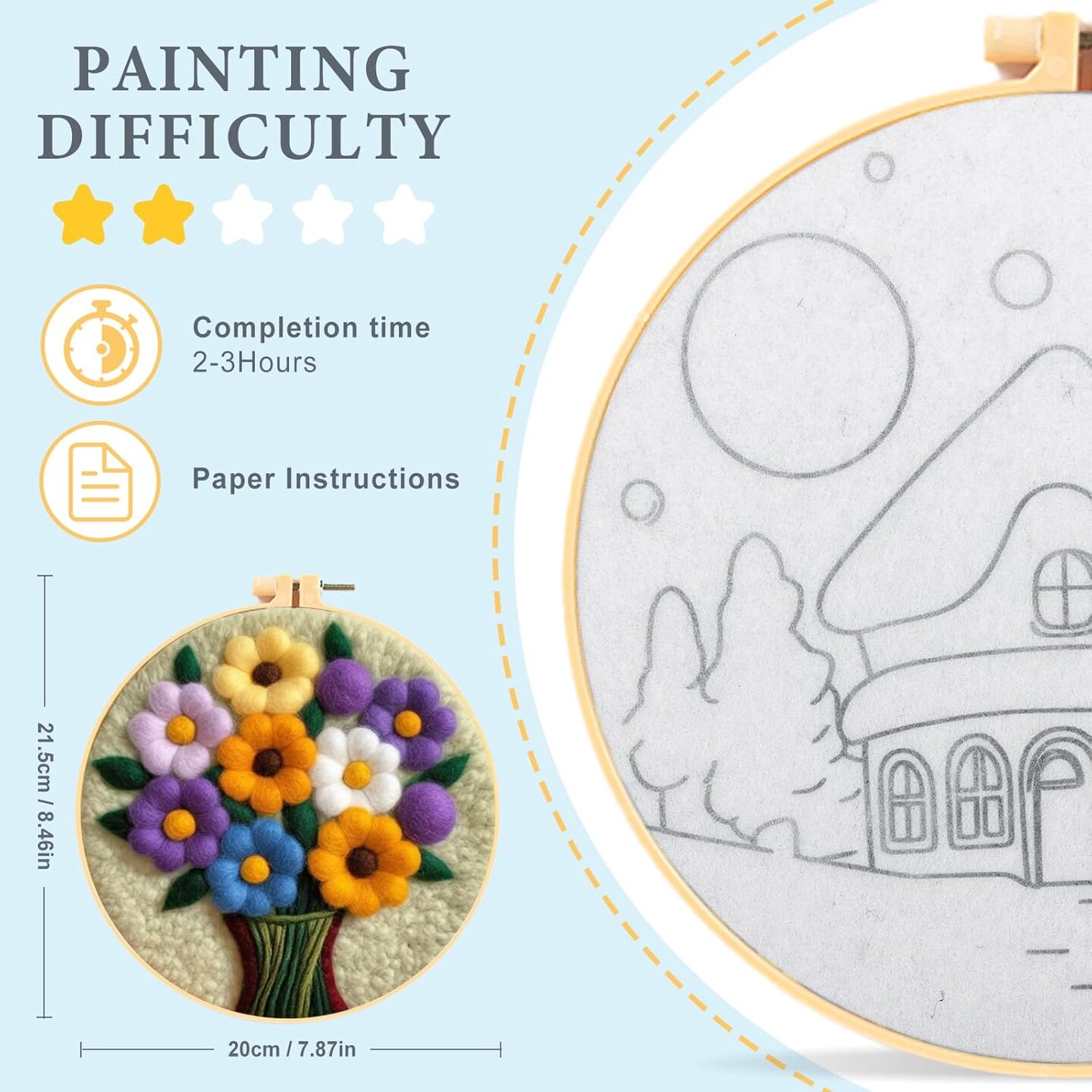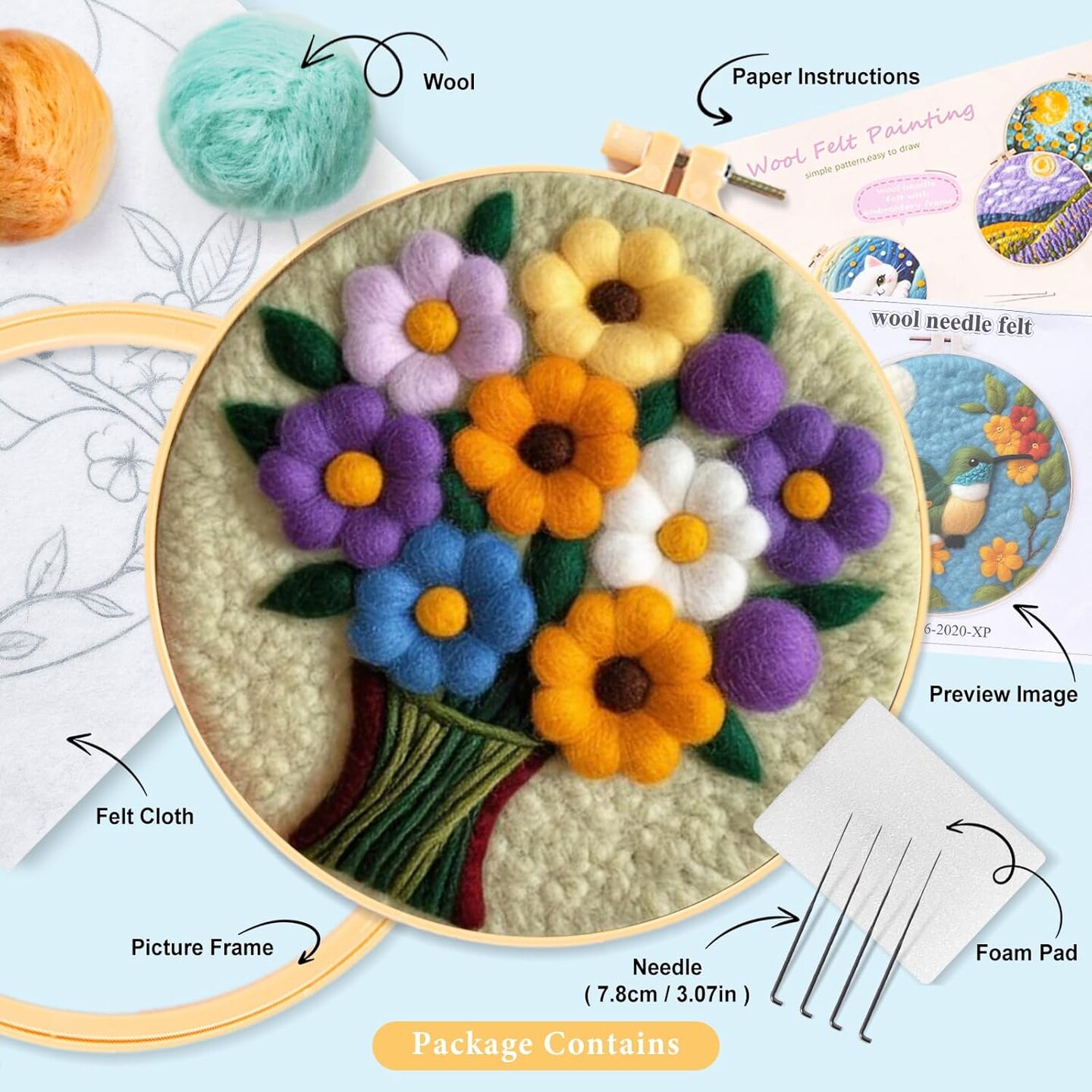 Flowers Needle Felting Kit for Beginner, Needle Wool Felting Set Include Needles, Foam Pad, Felt Cloth, Picture Frame, and Instructions