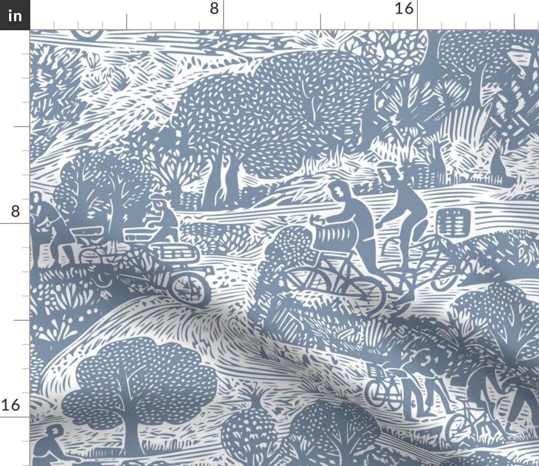 Folk Bicycle Toile Blue Monochrome Block Print Trees Lines Cycling Scandi Custom Printed Fabric by Spoonflower Various Fabrics by the Yard or Fat Quarter