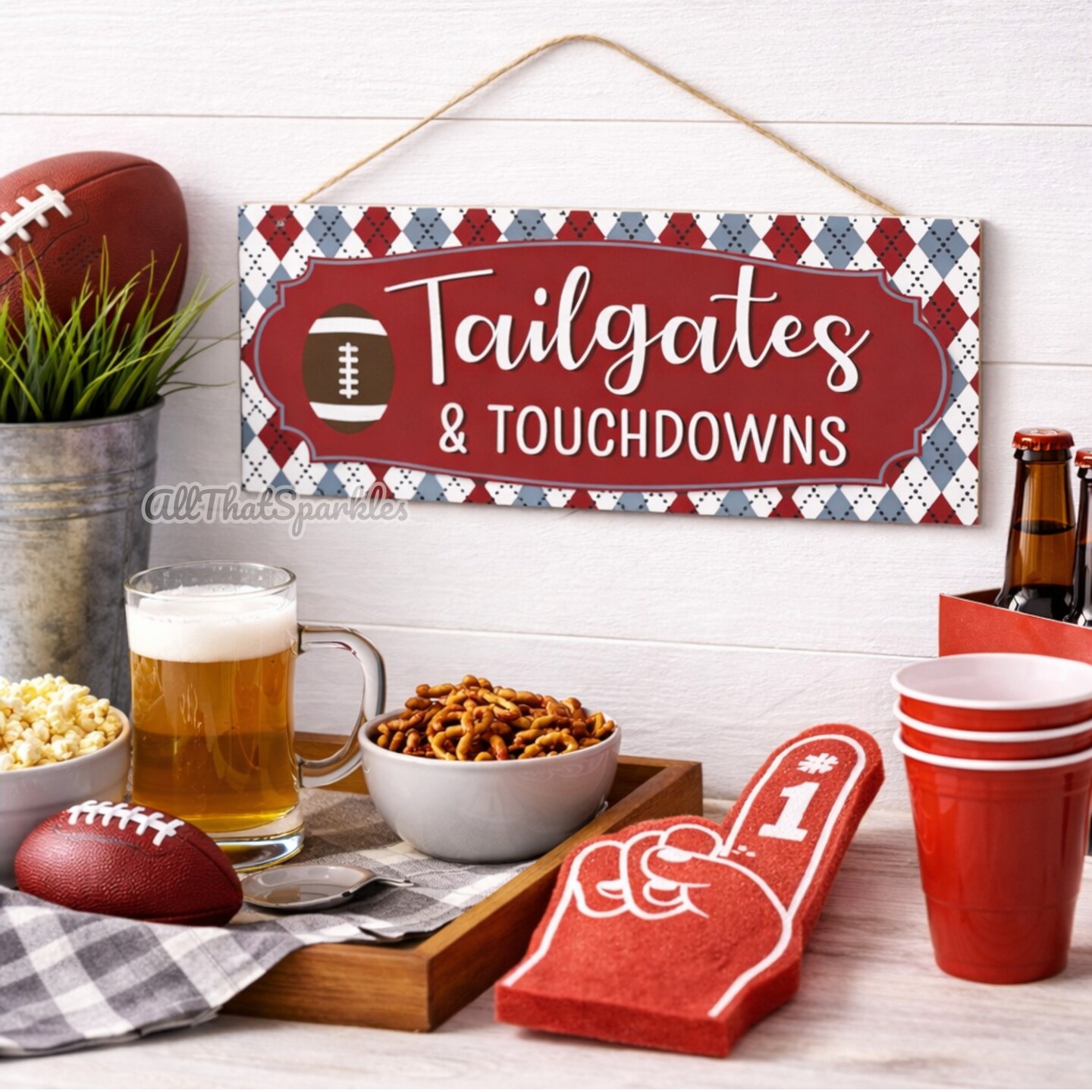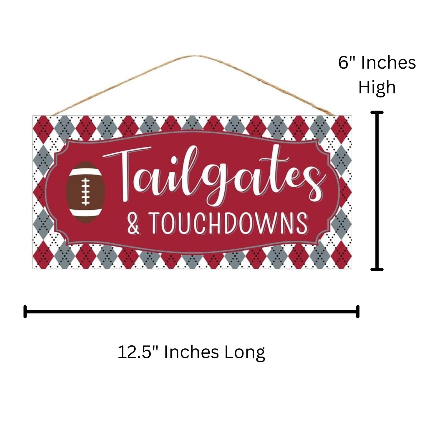Football Tailgates and Touchdowns Sports Sign, MDF Wood - Crimson Red, White, Grey, Multi, 12.5"L x 6"H - For Wreath Accents, Crafts, and Decorations